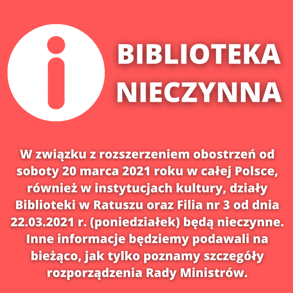 Bardzo ważna informacja dla książkoholików Od 19 kwietnia Wypożyczalnia Ogólna, Czytelnia oraz stanowisko zwrotów w Ratuszu będą dostępne w godzinach 10:00-14:00 Oddział dla Dzieci, Filie oraz RCEE pozostają zamknięte!