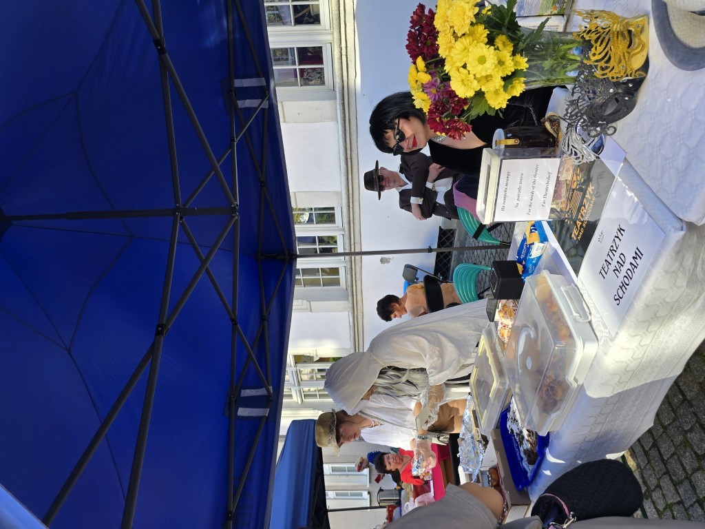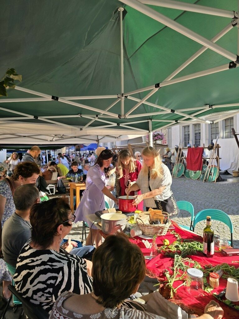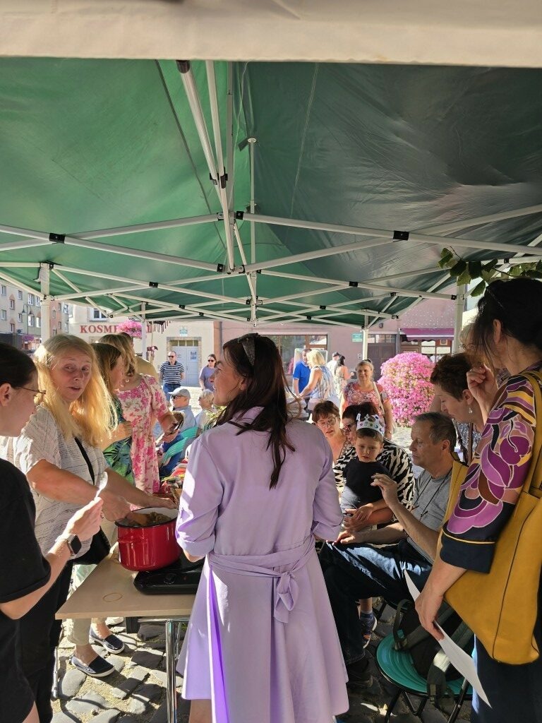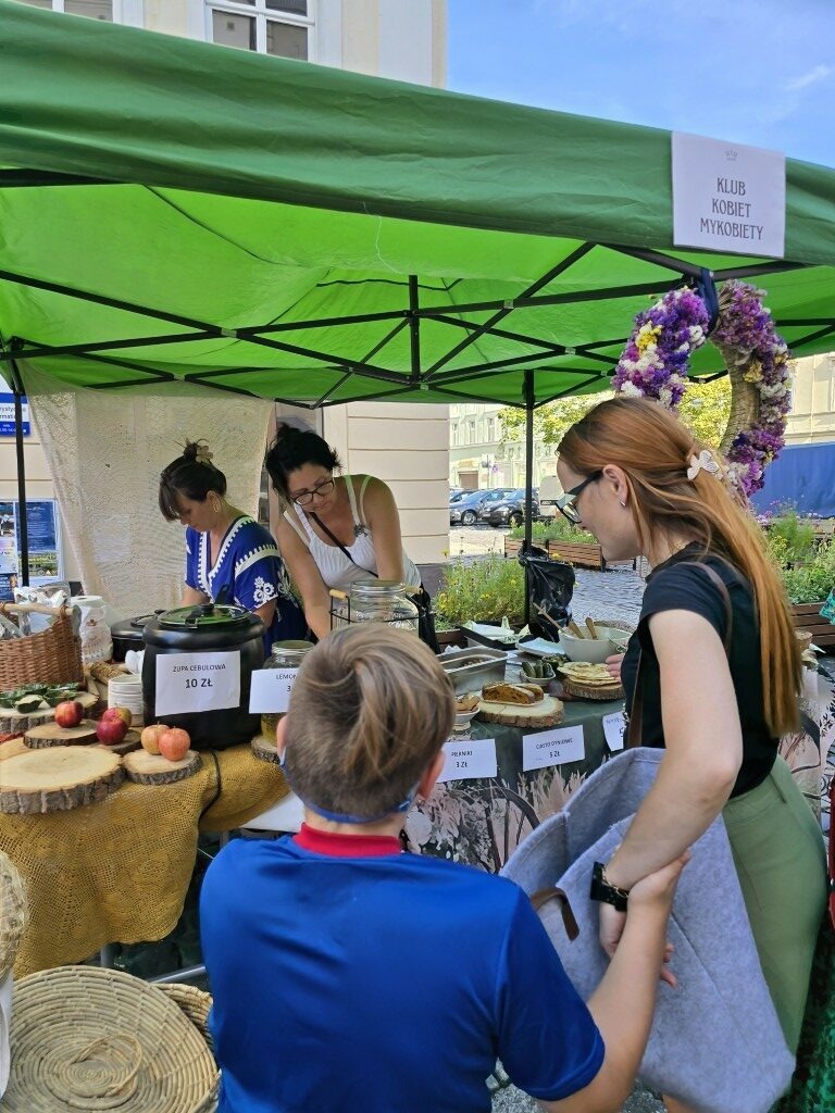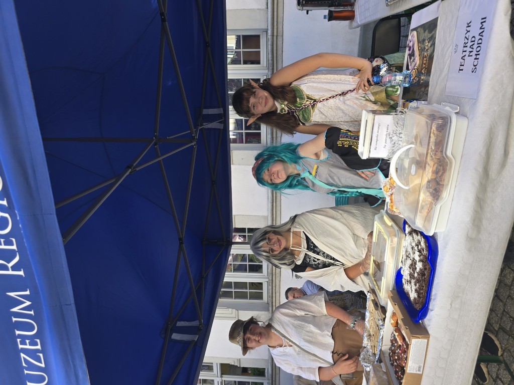 Przy tylu atrakcjach nie obyło się też bez smacznego jadła. Wspaniałe zapachy prowadziły do stoisk kulinarnych. Klub Kobiet MykobieTy przygotował, pieczone na miejscu, podpłomyki. Serwował zupę cebulową oraz raczył Klasztornym Chlebem Magdalenek i Klasztornymi Piernikami (przepisy inspirowane średniowieczną kuchnią klasztorną, również lubańskich sióstr Magdalenek oraz tradycyjnymi produktami Górnych Łużyc i Dolnego Śląska, stworzonymi przez Regionalne Centrum Edukacji Ekologicznej). Stoisko Koła Gospodyń Wiejskich z Włosienia uginało się od dobroci, od bigosu, po gofry. Nawet Teatrzyk nad Schodami postanowił upiec wspaniałe wypieki, by nazbierać w sakwę na swoje wydatki. Biblioteczna kawa i herbata pasowały do tego idealnie. Tak samo jak książki, kupione na przygotowanym przez nas kiermaszu.
