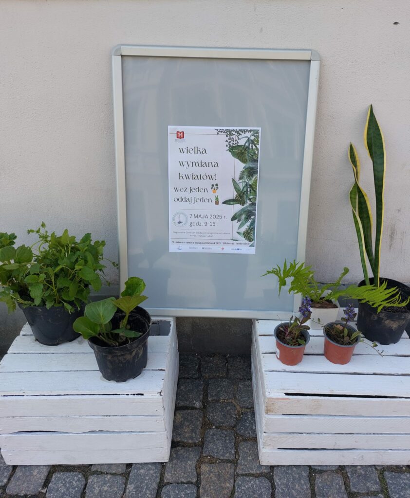Regionalne Centrum Edukacji Ekologicznej zaprosiło na Wielką Wymianę Kwiatów. Każdy mógł się wymienić swoimi kwiatkami i urozmaicić swoją domową dżunglę. Podyskutowaliśmy również o książkach w Klubie Książki dla dorosłych. A ManuKultura oczywiście z otwartym sercem i chętnymi dłońmi dziergała z nowymi członkiniami.