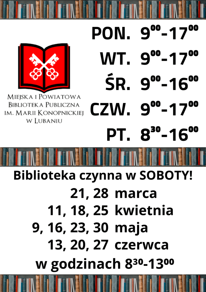 - Godziny pracy w okresie świątecznymDużo wolnego, to też dużo czasu na wsiąknięcie w lekturę.📚Nie zapomnijcie uzupełnić książkowych zapasów!📖 W okresie najbliższych świąt Biblioteka w Ratuszu będzie czynna:23 grudnia: 8:30 – 15:3024 – 28 grudnia: nieczynne29 grudnia: 9:00 – 17:0030 grudnia: 9:00 – 17:0031 grudnia:…