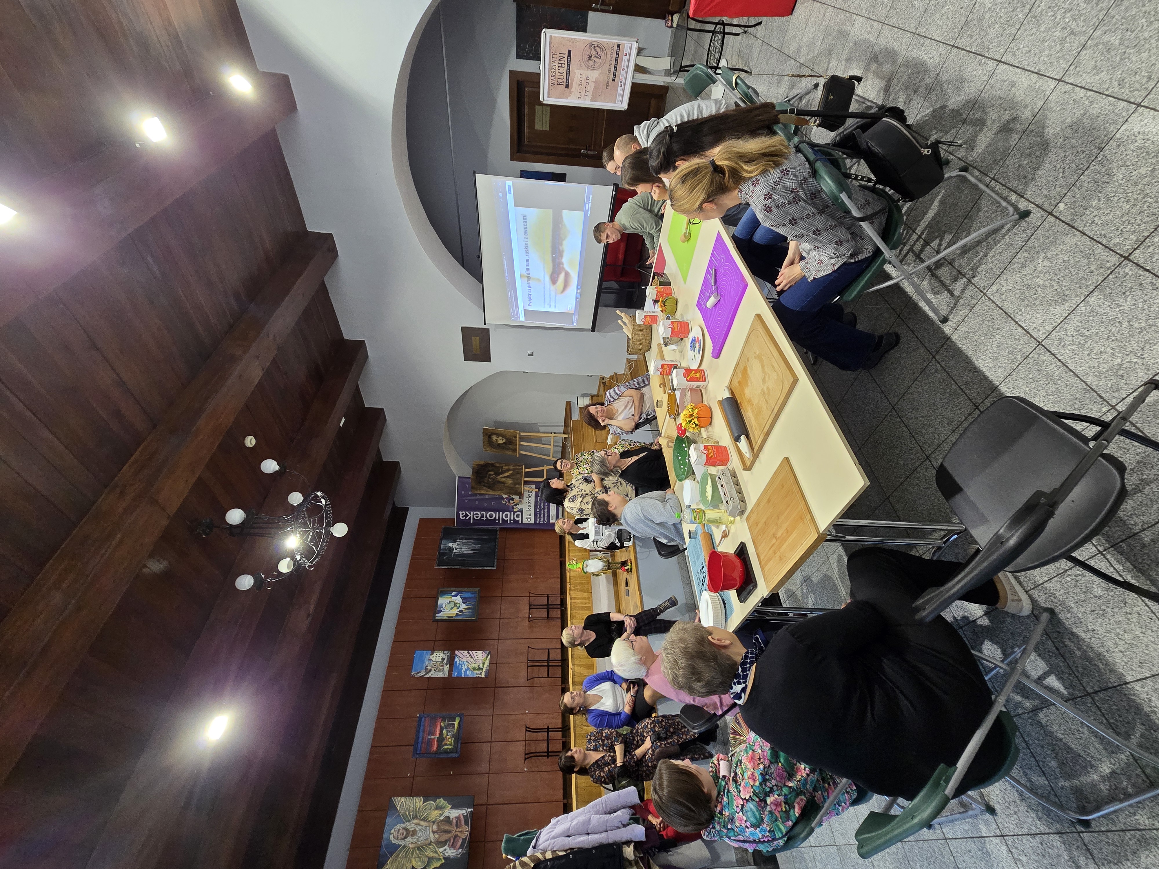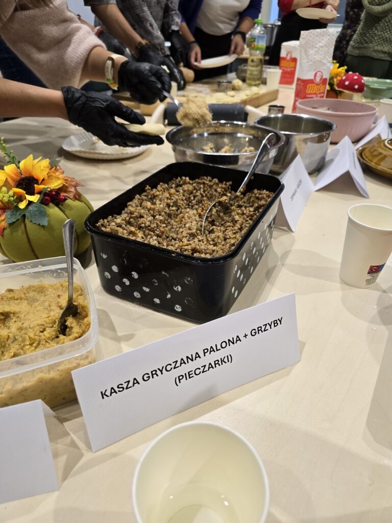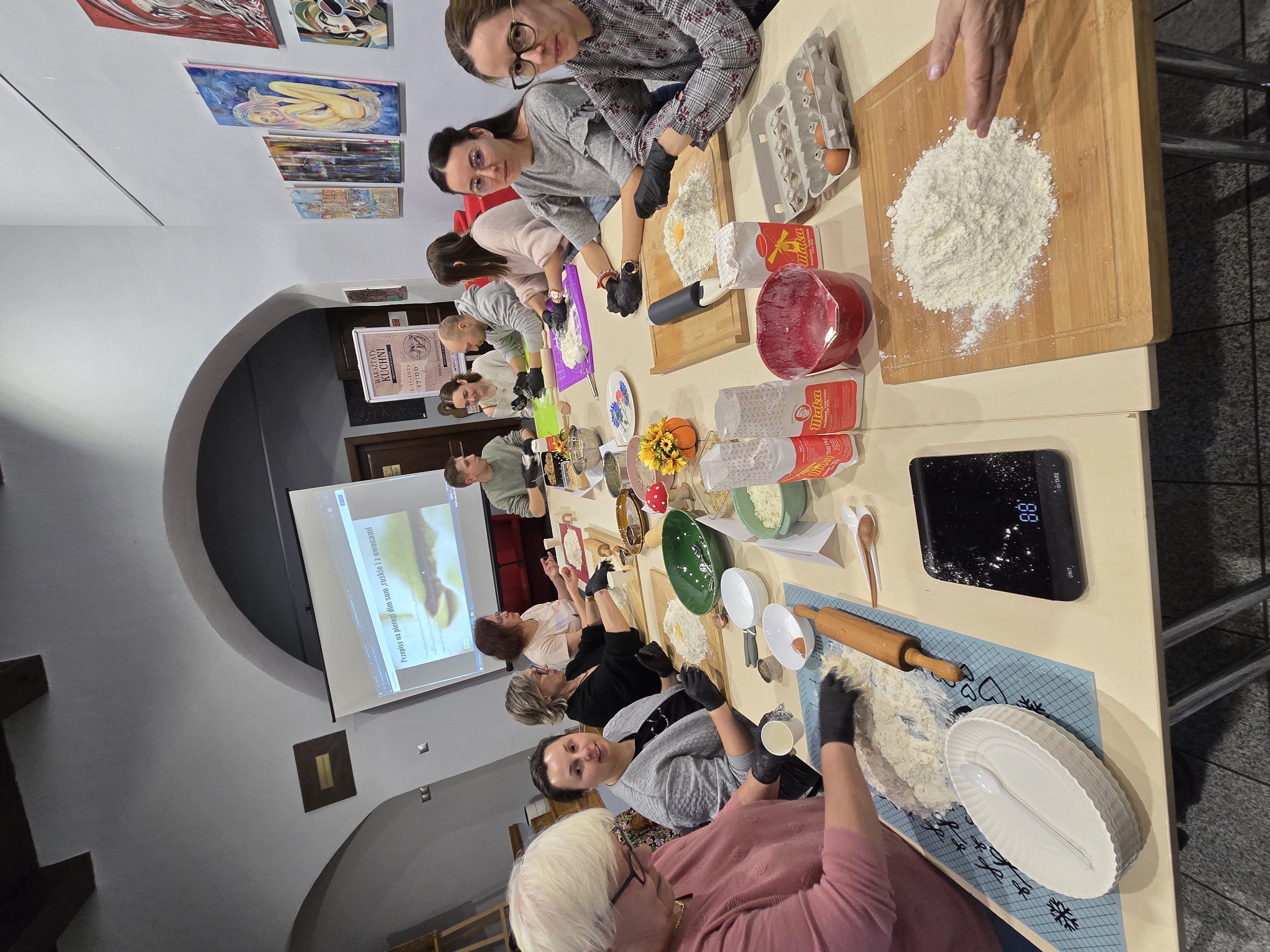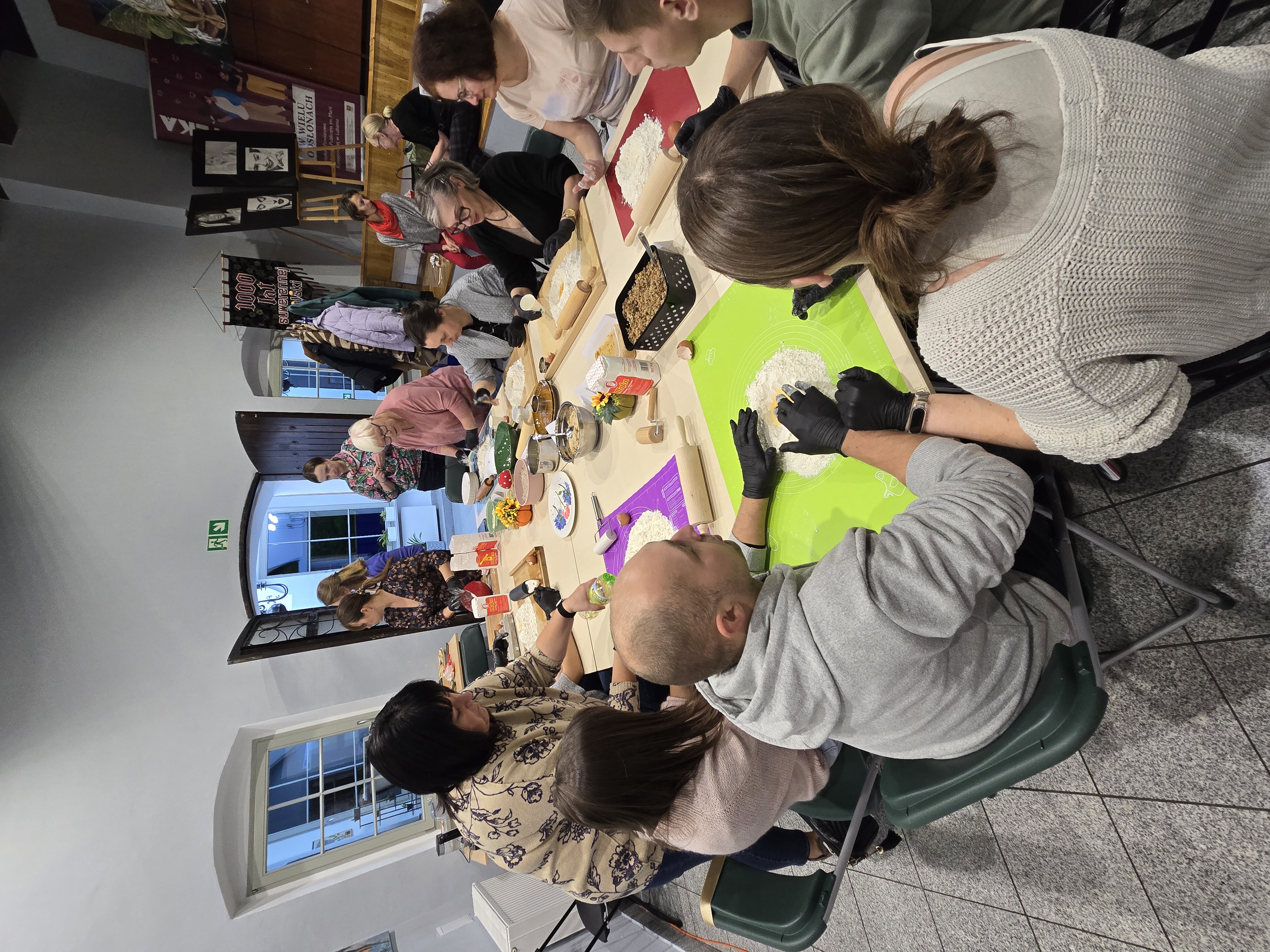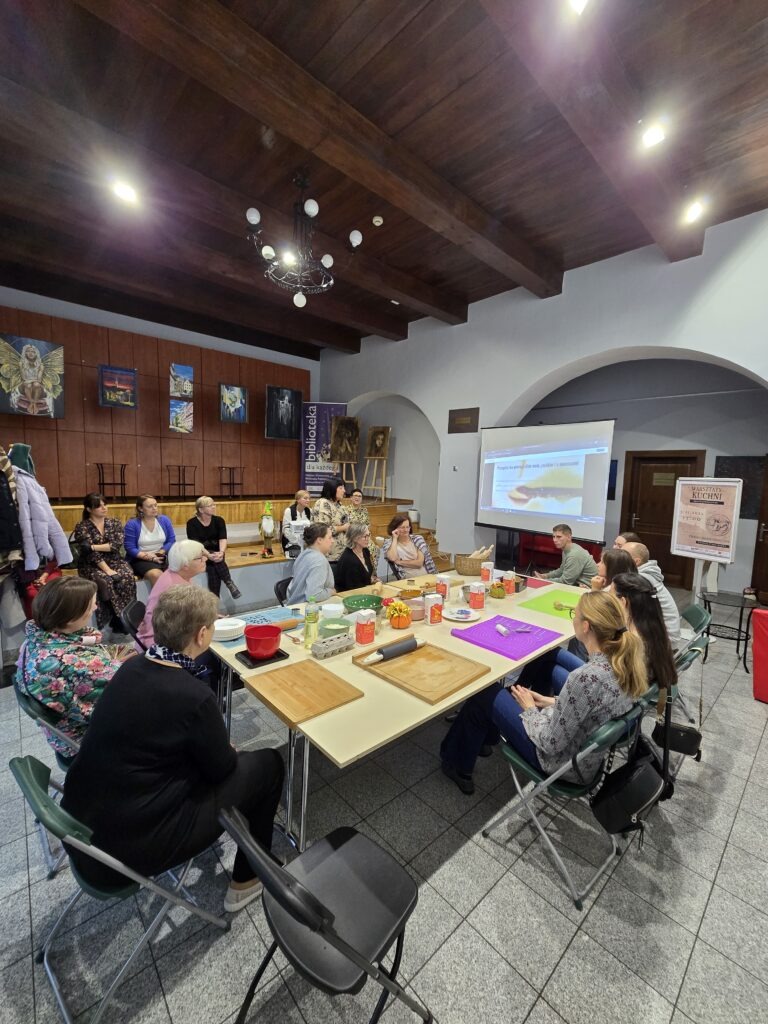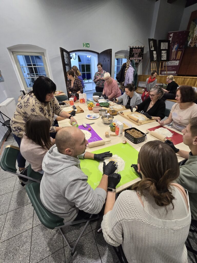 Zajęcia cieszyły się dużą frekwencją. Licznie przybyli uczestnicy mieli okazję nie tylko poznać przepisy na pierogi przygotowane według dawnych receptur, ale także wysłuchać ciekawego wykładu o pochodzeniu pierogów i ich różnorodności form. Tajemnice średniowiecznej kuchni przekazały Panie z Klubu Kobiet MykobieTy.