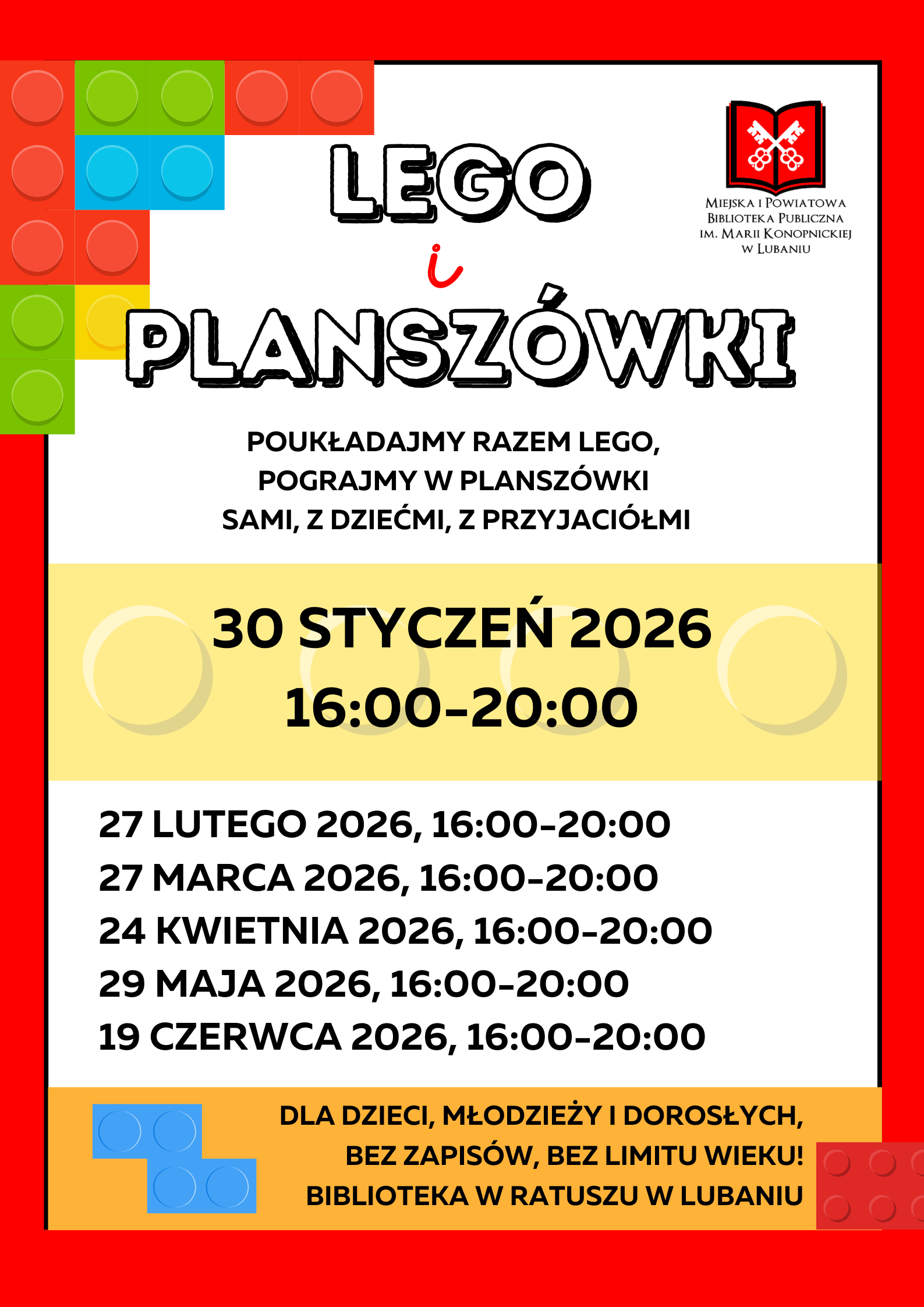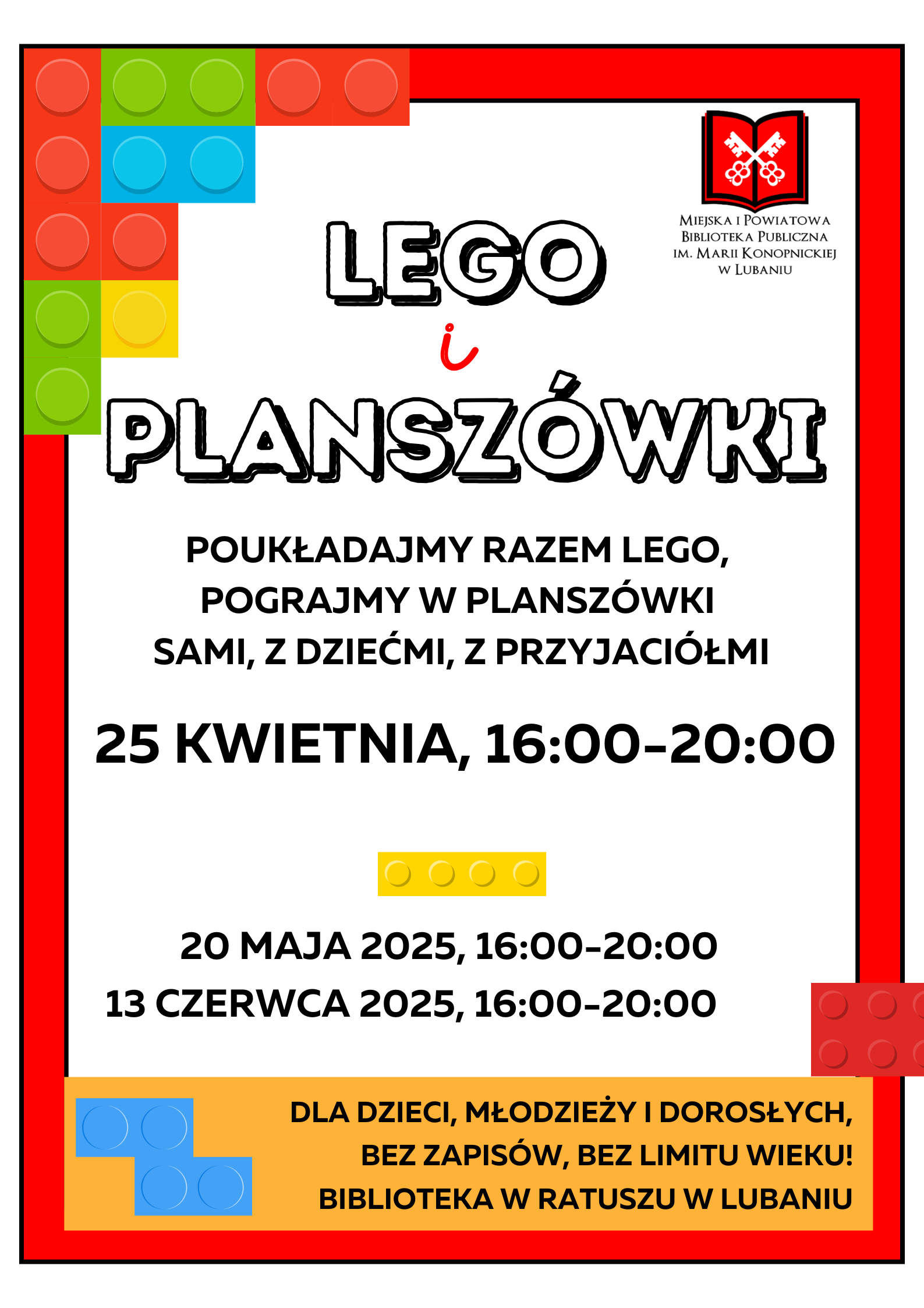 Zapraszamy na kolejne comiesięczne spotykania miłośników LEGO i gier planszowych. Spotkania odbywają się w ostatni (zazwyczaj) piątek miesiąca w godzinach od 16:00 do 20:00.