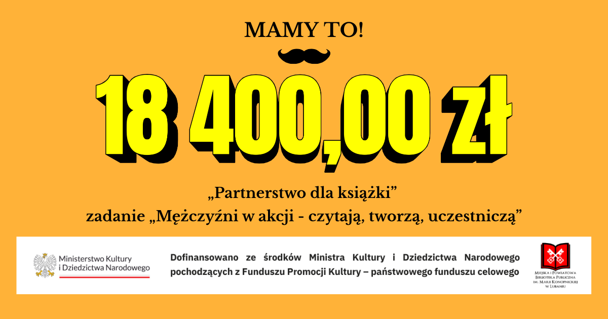 Z wielką radością informujemy, iż Miejska i Powiatowa Biblioteka Publiczna w Lubaniu po raz kolejny otrzymała grant w wysokości 18 400,00 zł w programie „Partnerstwo dla książki” na projekt złożony do Ministerstwa Kultury i Dziedzictwa Narodowego na zadanie „Mężczyźni w akcji- czytają, tworzą, uczestniczą” na działania promujące książkę i bibliotekę.
