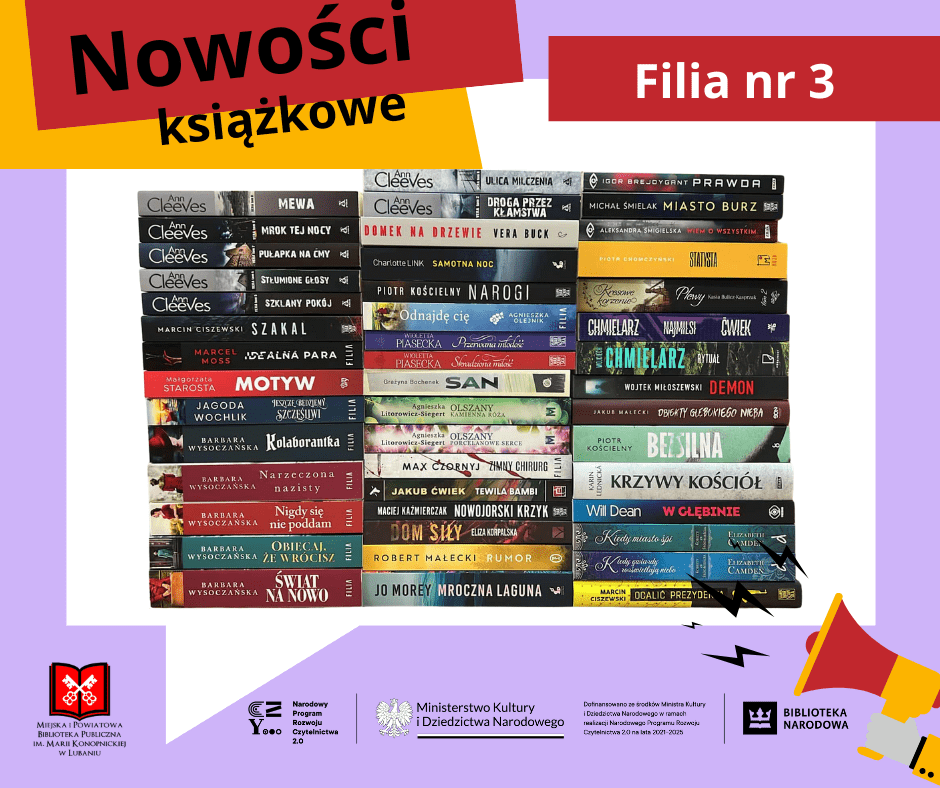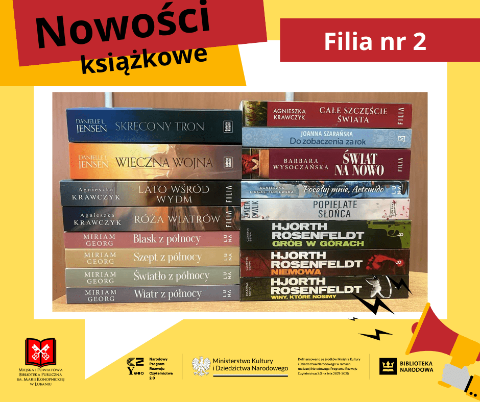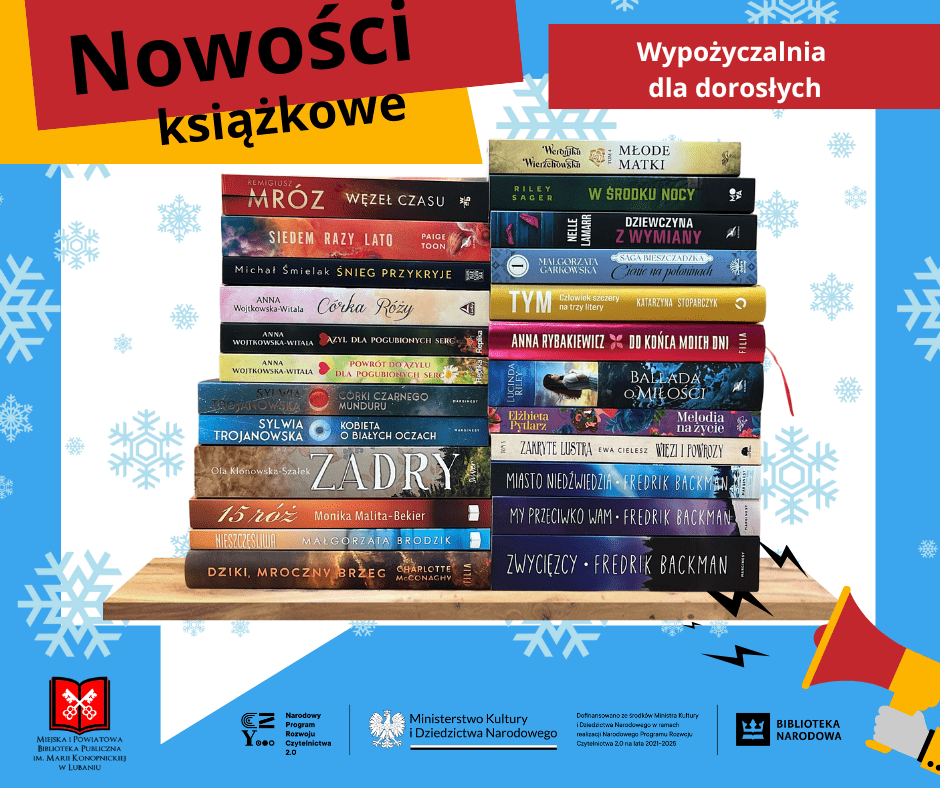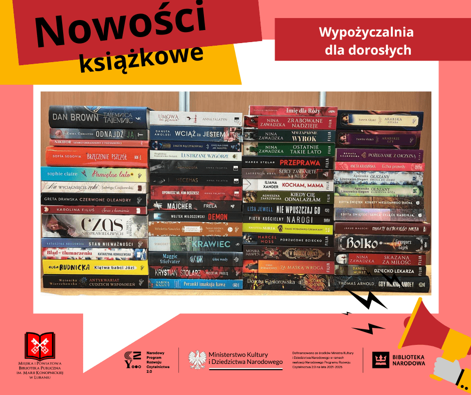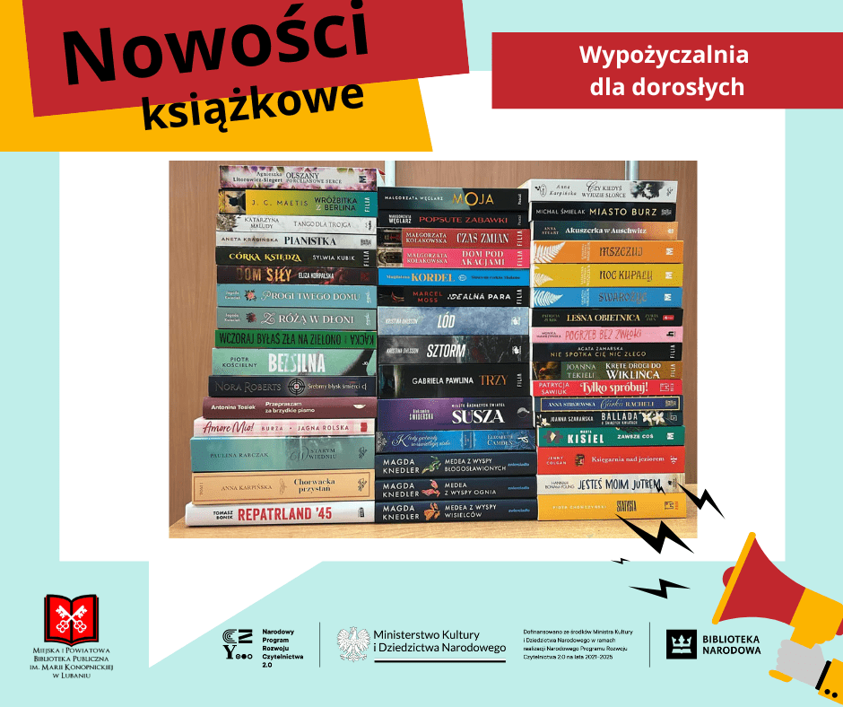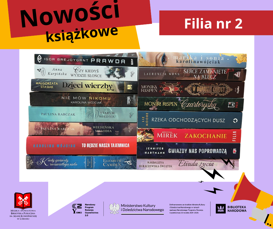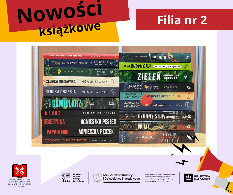 Zakup nowości był możliwy dzięki wsparciu Ministra Kultury i Dziedzictwa Narodowego w ramach Narodowego Programu Rozwoju Czytelnictwa 2.0 na lata 2021-2025, zadanie: Dofinansowania dla bibliotek publicznych na zakup nowości wydawniczych oraz usługi zdalnego dostępu do książek w formatach e-booków i/lub audiobooków i/lub synchrobooków – Priorytet 1, Kierunek interwencji 1.1. w ramach NPRCz 2.0.