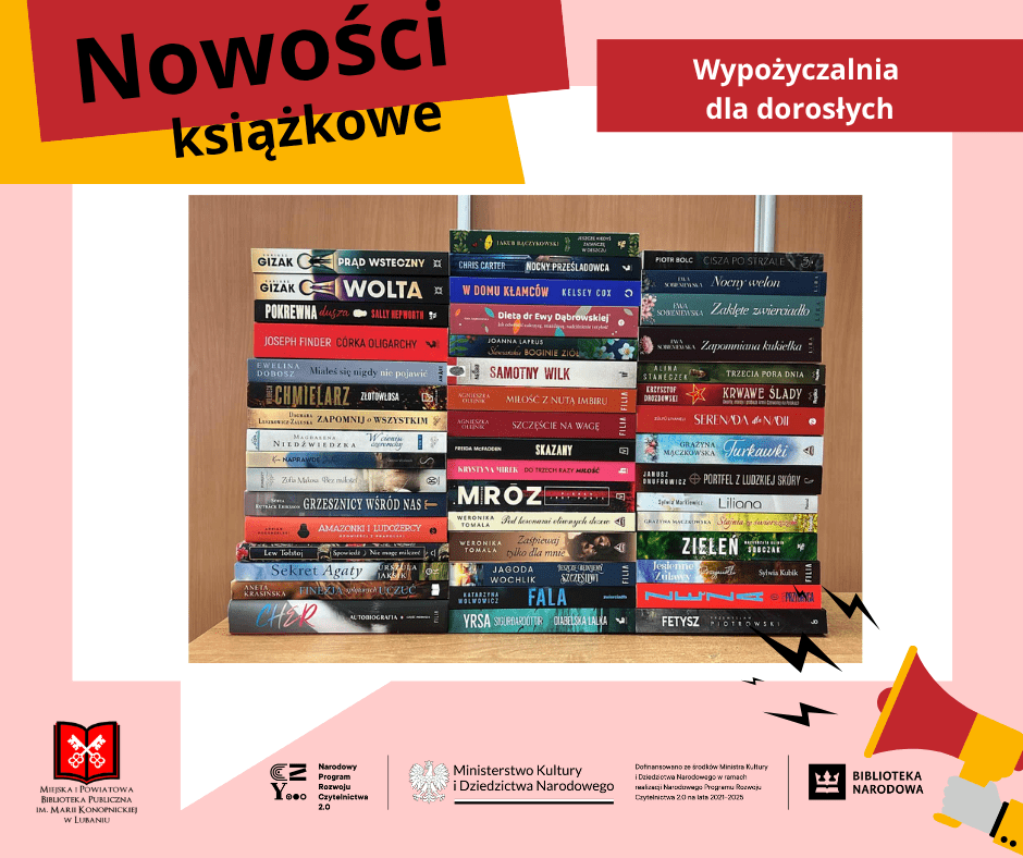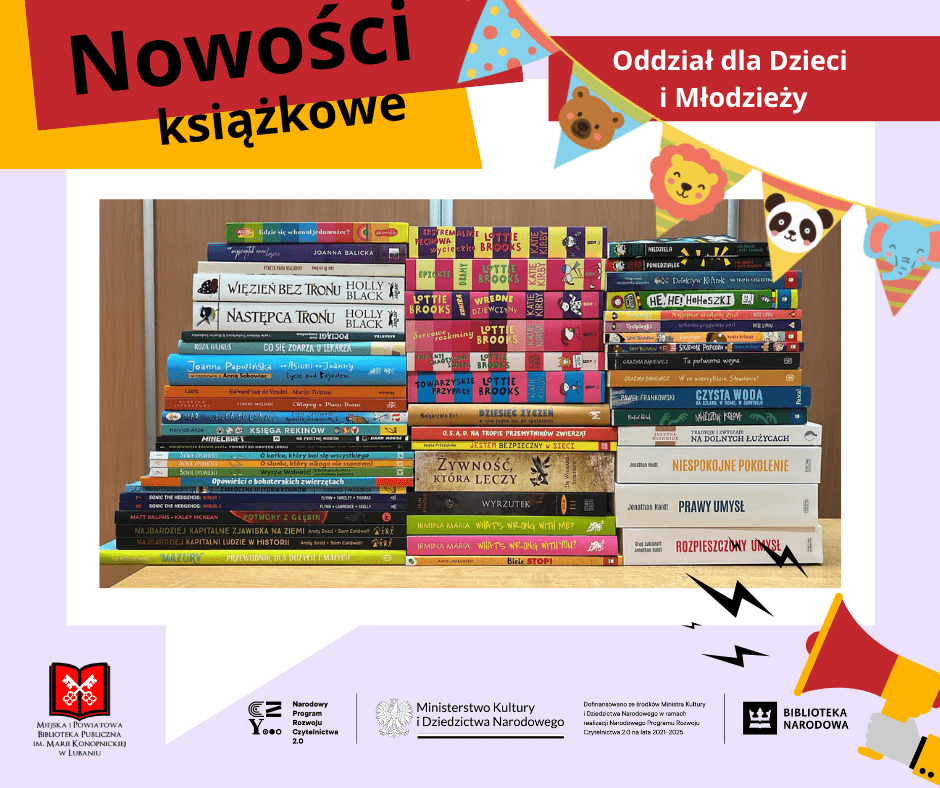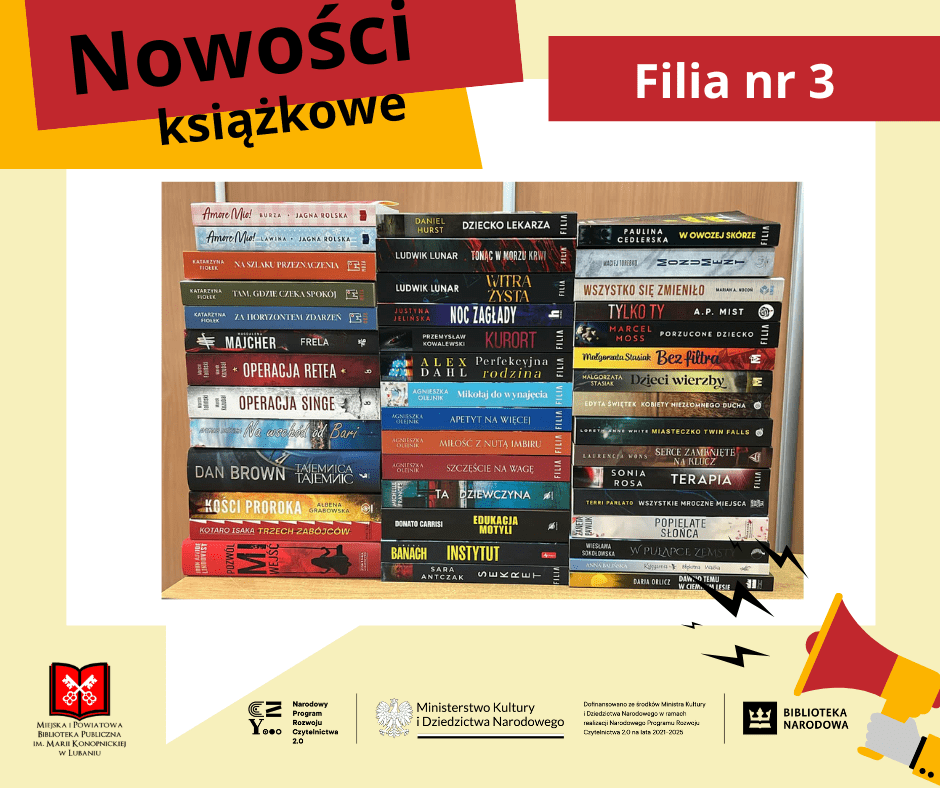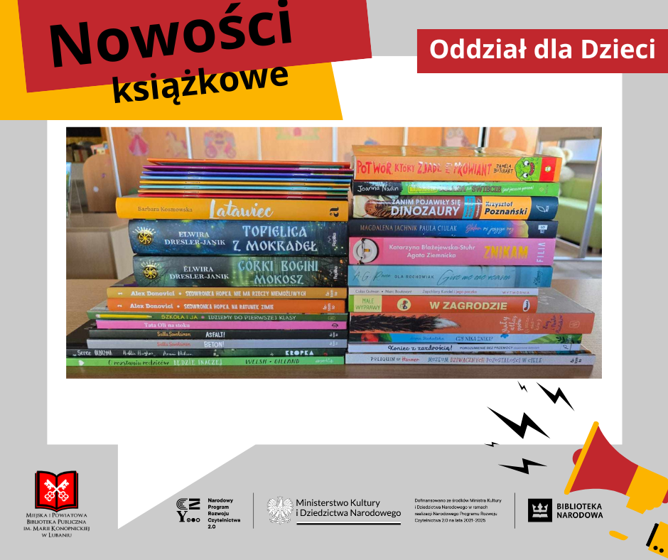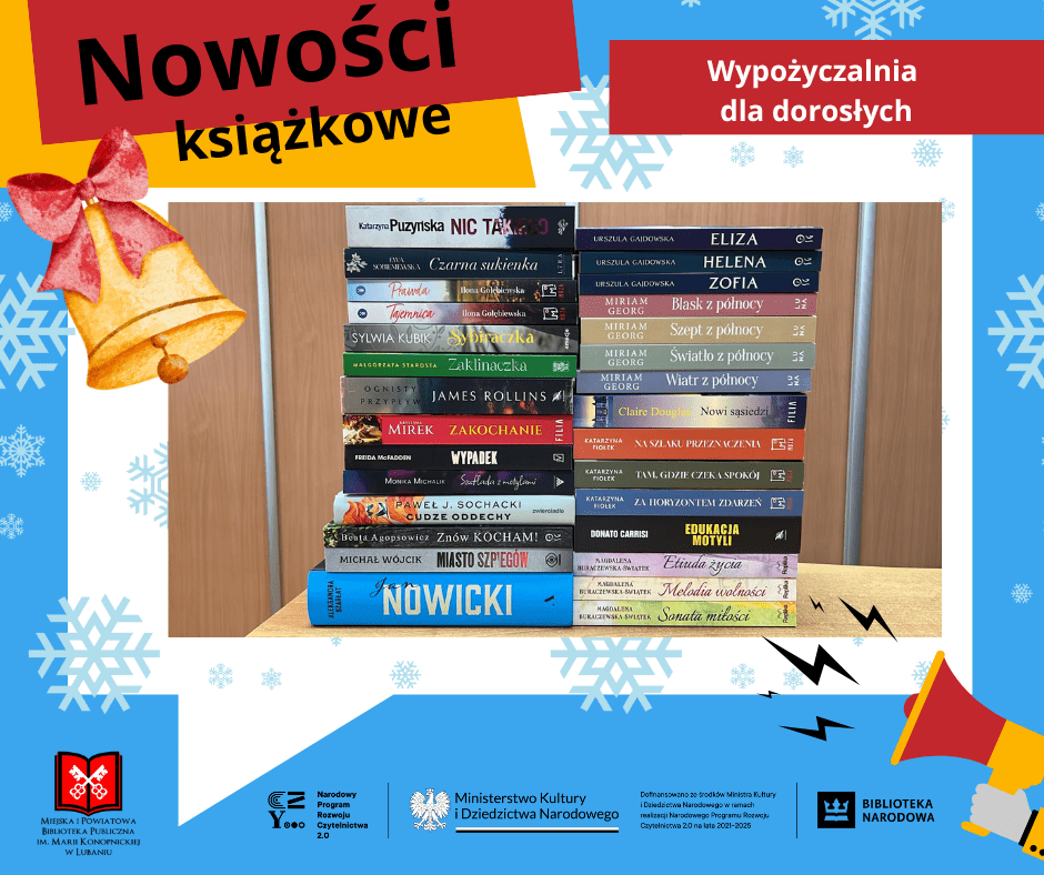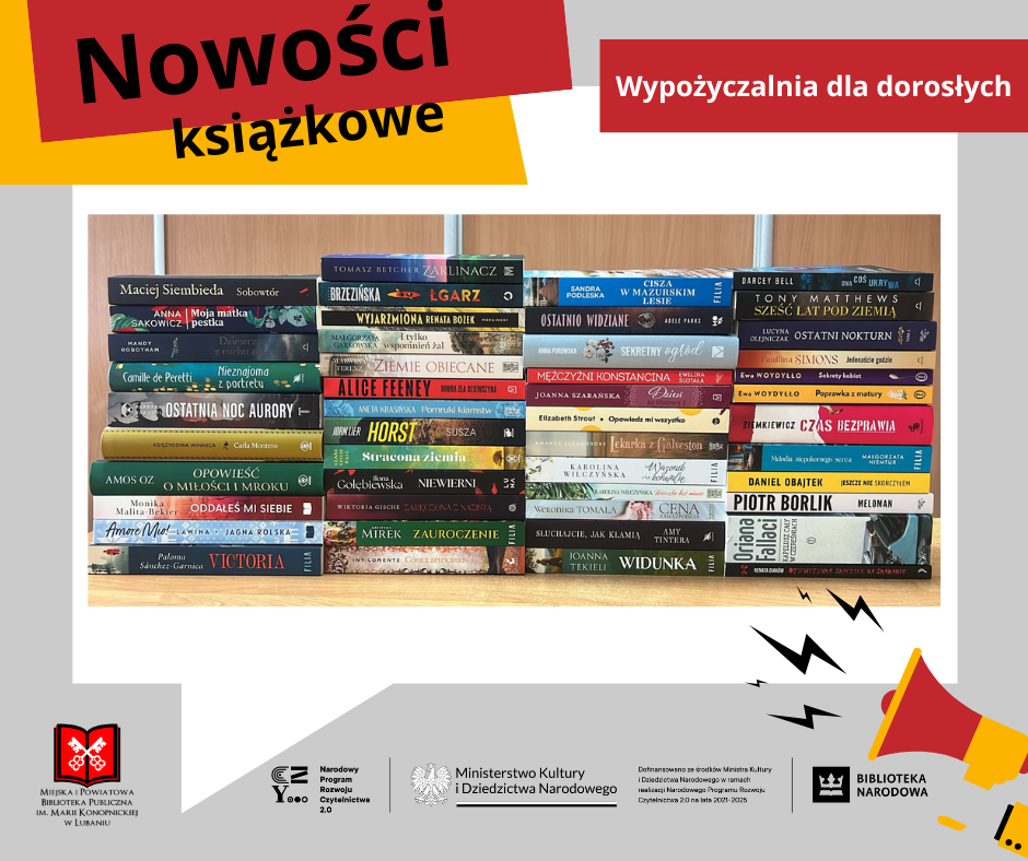 Zakup nowości był możliwy dzięki wsparciu Ministra Kultury i Dziedzictwa Narodowego w ramach Narodowego Programu Rozwoju Czytelnictwa 2.0 na lata 2021-2025, zadanie: Dofinansowania dla bibliotek publicznych na zakup nowości wydawniczych oraz usługi zdalnego dostępu do książek w formatach e-booków i/lub audiobooków i/lub synchrobooków – Priorytet 1, Kierunek interwencji 1.1. w ramach NPRCz 2.0.