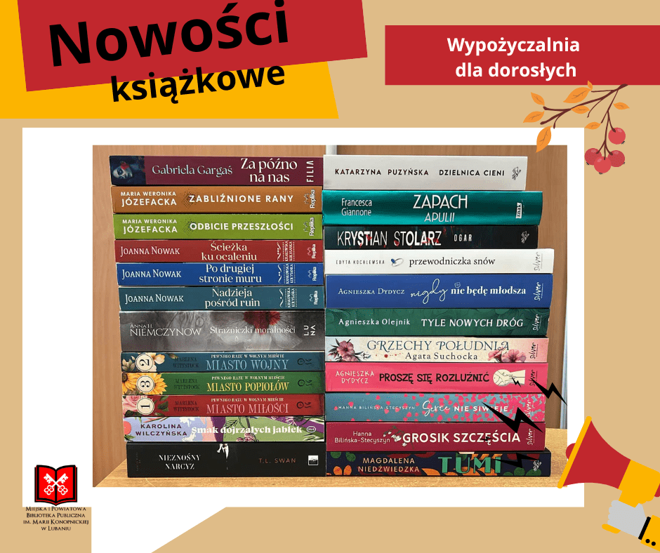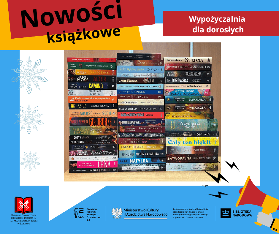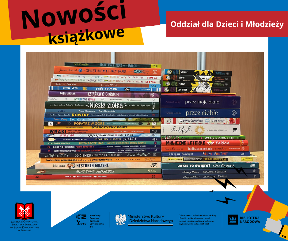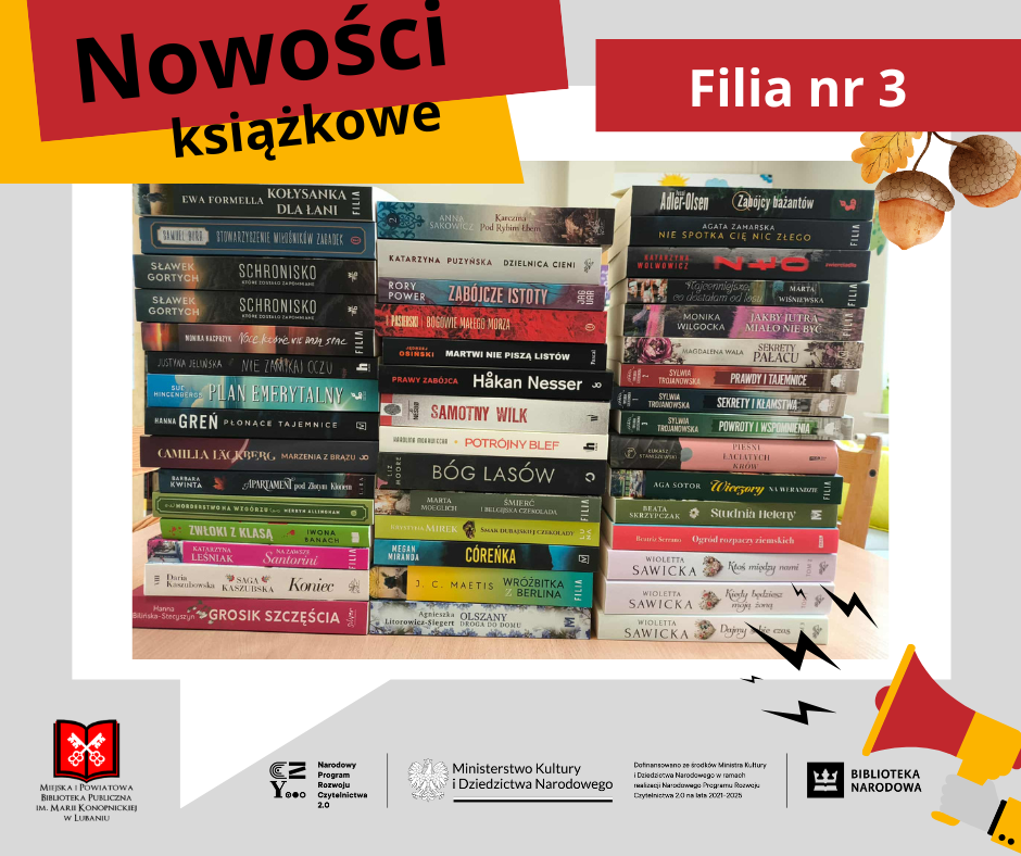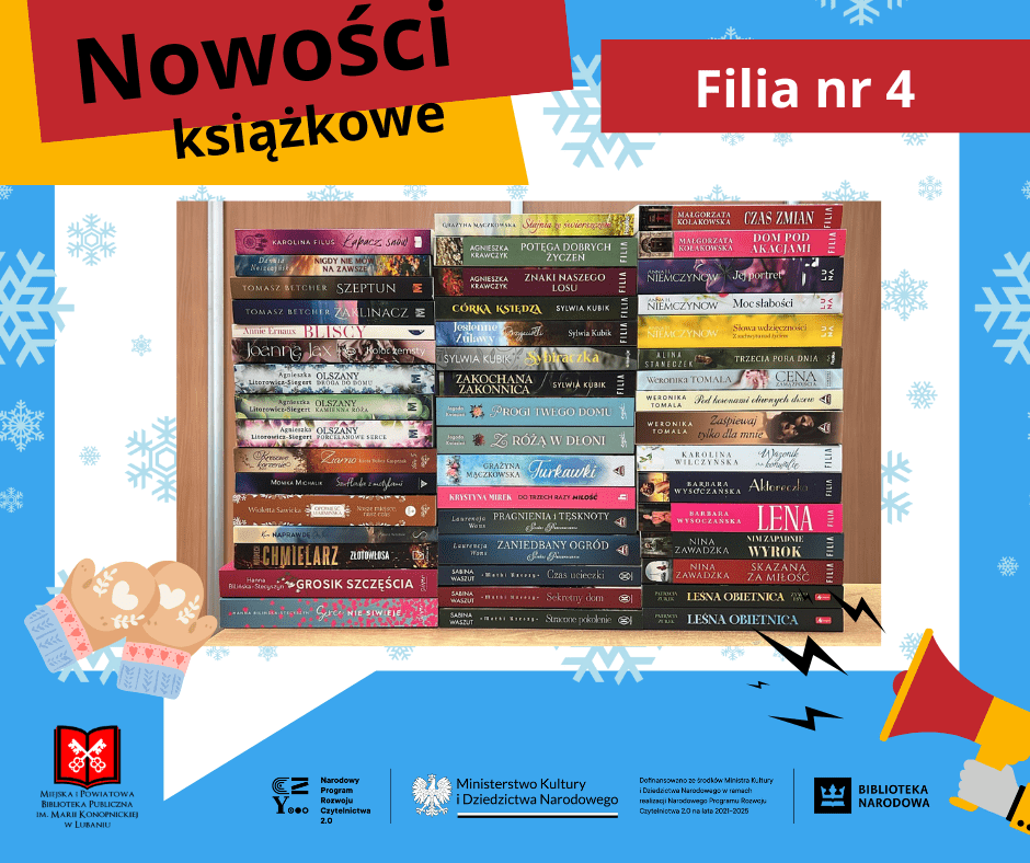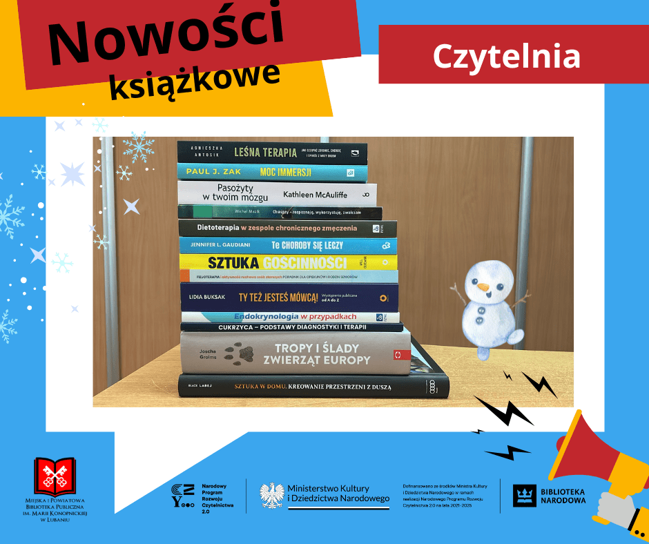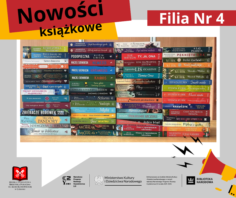 Zakup nowości był możliwy dzięki wsparciu Ministra Kultury i Dziedzictwa Narodowego w ramach Narodowego Programu Rozwoju Czytelnictwa 2.0 na lata 2021-2025, zadanie: Dofinansowania dla bibliotek publicznych na zakup nowości wydawniczych oraz usługi zdalnego dostępu do książek w formatach e-booków i/lub audiobooków i/lub synchrobooków – Priorytet 1, Kierunek interwencji 1.1. w ramach NPRCz 2.0.