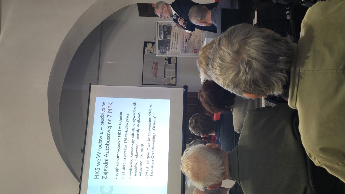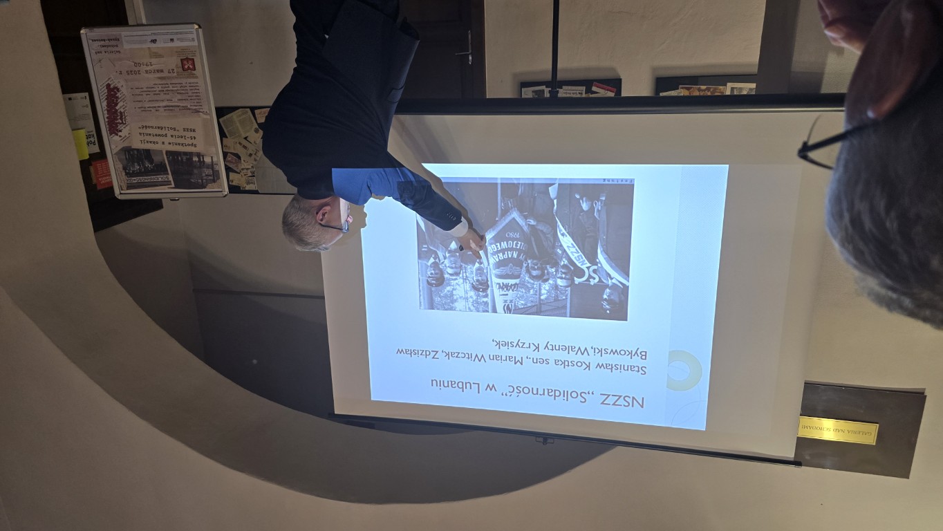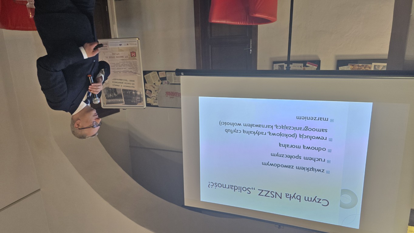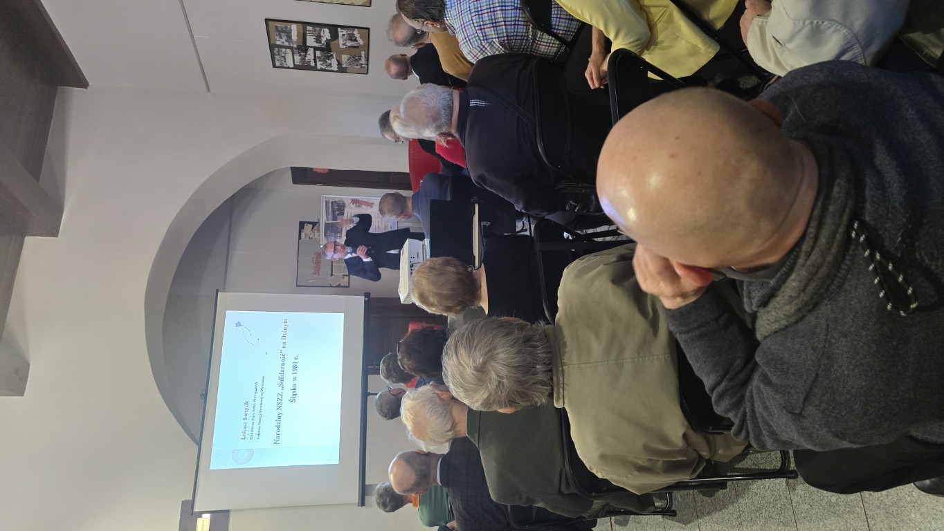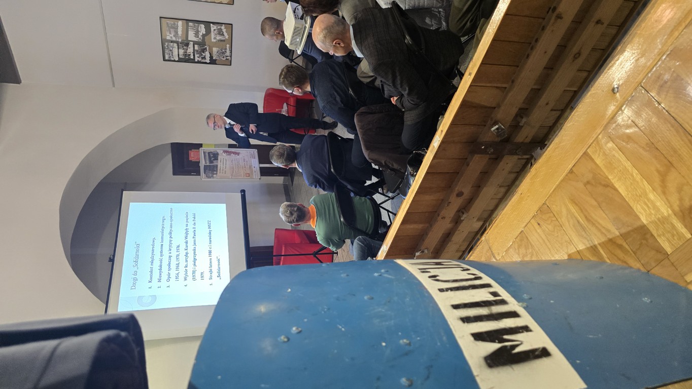 Zdjęcie przedstawia salę podczas wykładu zatytułowanego „Drogi do Solidarności”. Prelegent stoi obok ekranu projekcyjnego, wskazując na slajd, który zawiera listę kluczowych etapów prowadzących do powstania ruchu „Solidarność”. W pierwszym planie widoczna jest niebieska tarcza z napisem „MILICJA”. Publiczność siedzi i uważnie śledzi prezentację. Sala ma jasne ściany i drewniany sufit z widocznymi belkami, co nadaje wnętrzu historyczny charakter.