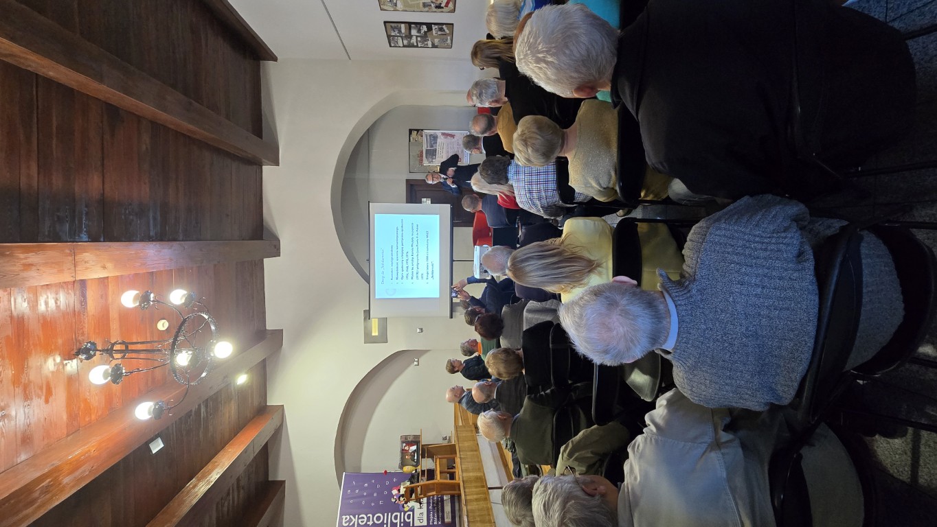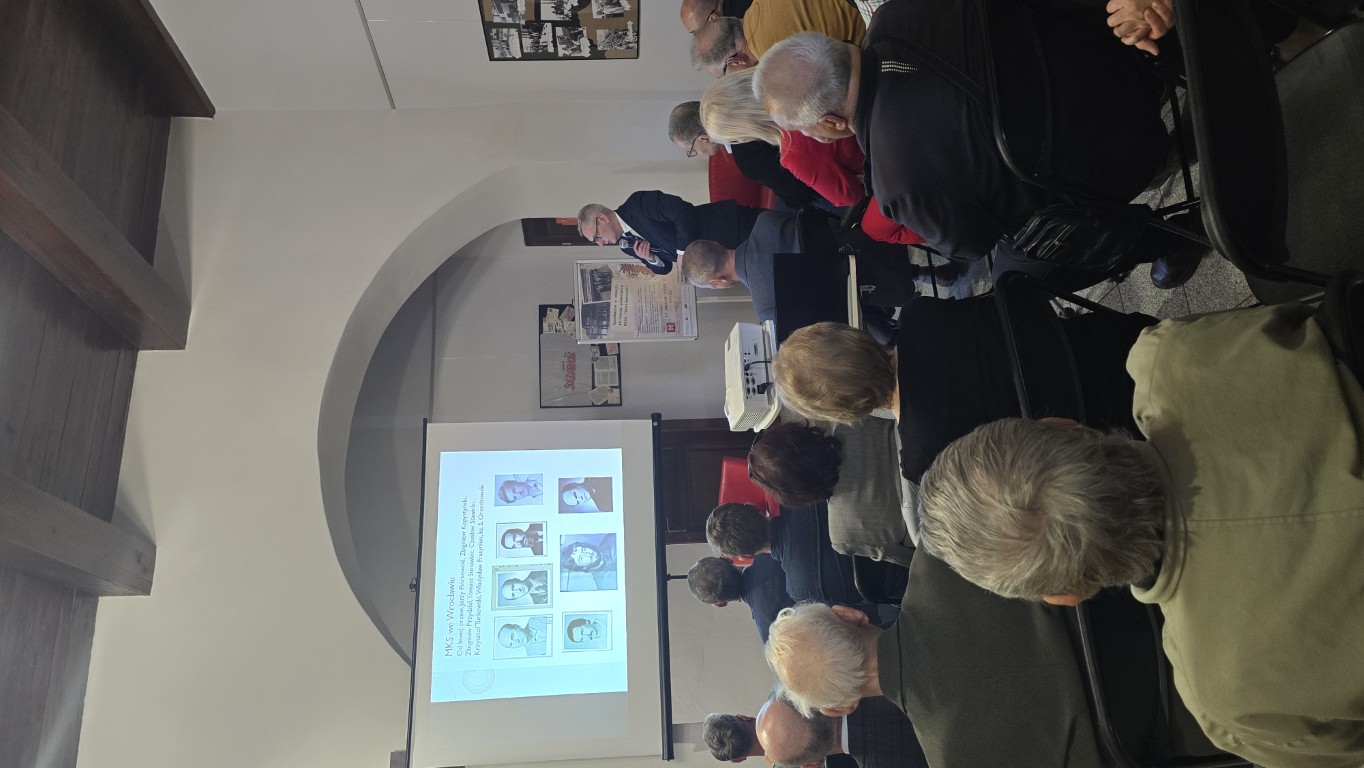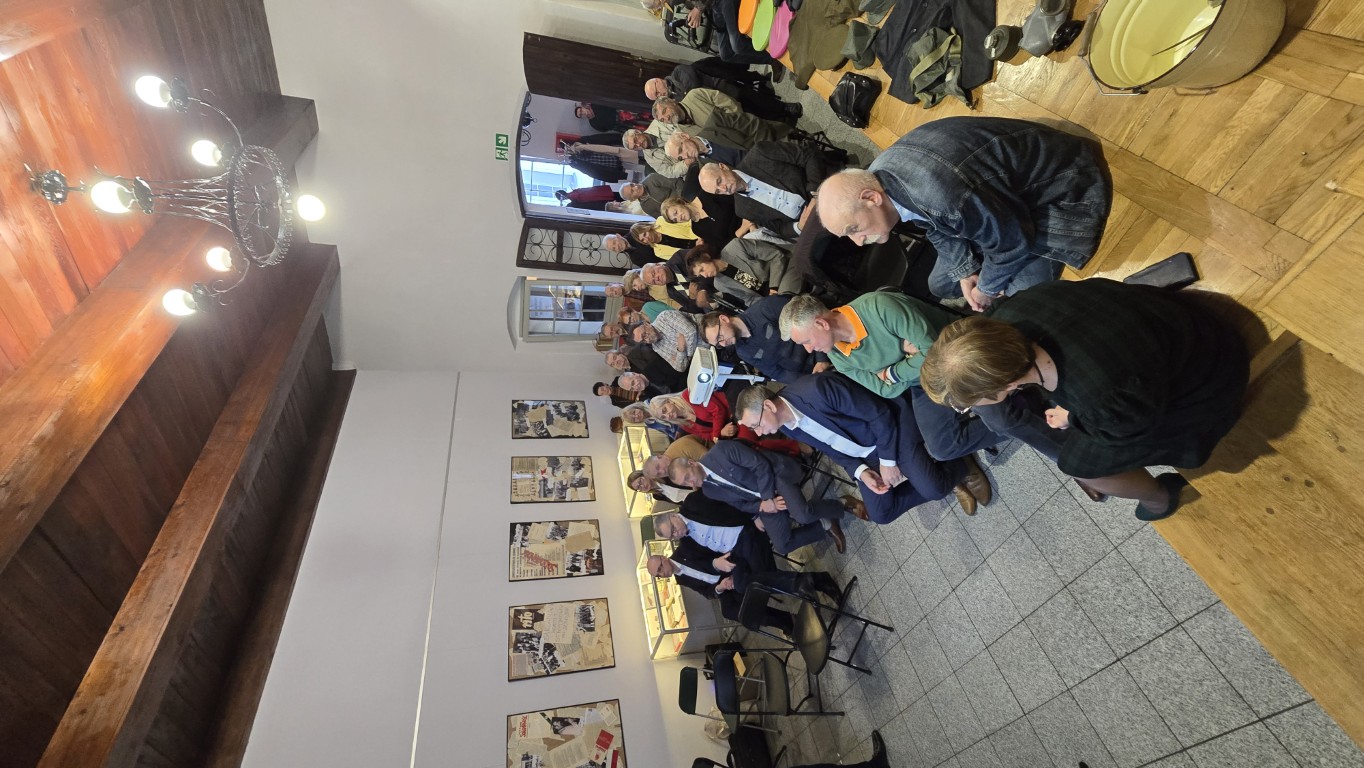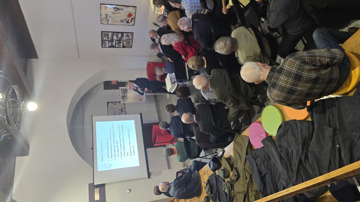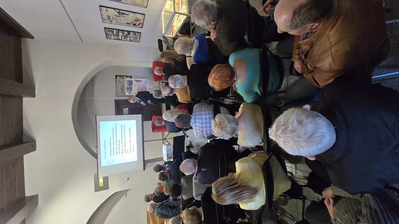 Zdjęcie przedstawia salę podczas wykładu zatytułowanego „Drogi do Solidarności”. Prelegent stoi obok ekranu projekcyjnego, wskazując na slajd, który zawiera listę kluczowych etapów prowadzących do powstania ruchu „Solidarność”. W pierwszym planie widoczna jest niebieska tarcza z napisem „MILICJA”. Publiczność siedzi i uważnie śledzi prezentację. Sala ma jasne ściany i drewniany sufit z widocznymi belkami, co nadaje wnętrzu historyczny charakter.