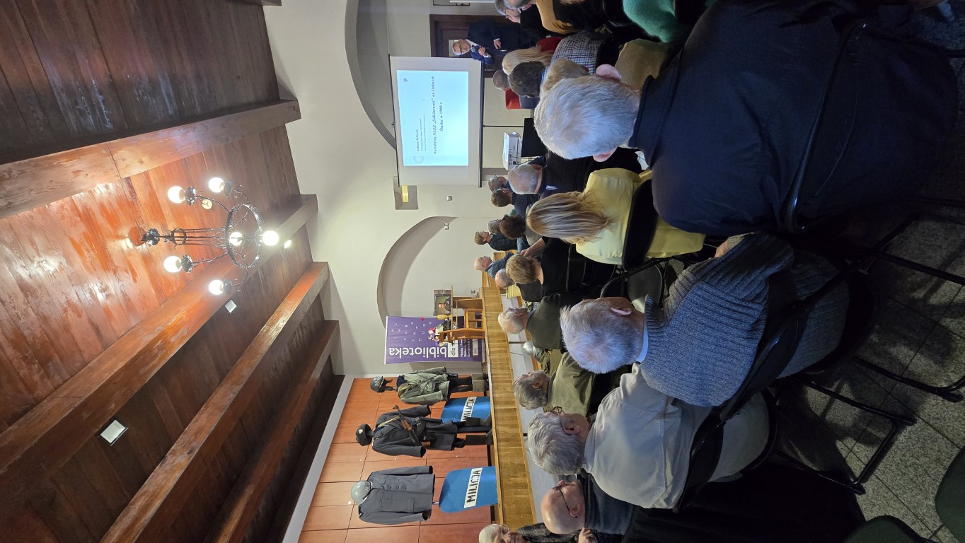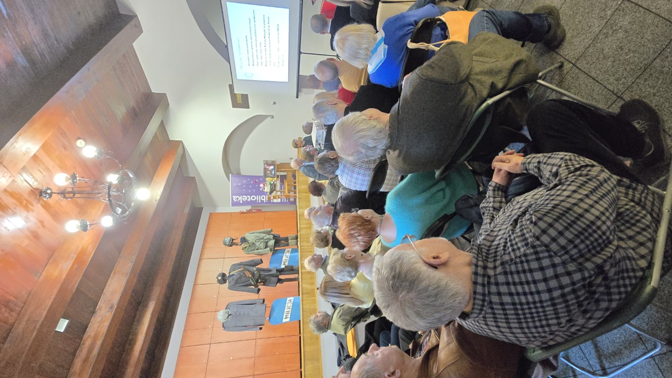 Zdjęcie przedstawia salę z uczestnikami siedzącymi i oglądającymi prezentację. Na scenie znajdują się trzy manekiny w historycznych mundurach oraz ekran z wyświetlonym slajdem zawierającym powtarzający się napis „Policja Państwowa”. Obok sceny widoczny jest baner z napisem „biblioteka”. Sala ma drewniany sufit z żyrandolem, co nadaje wnętrzu klasyczny charakter.