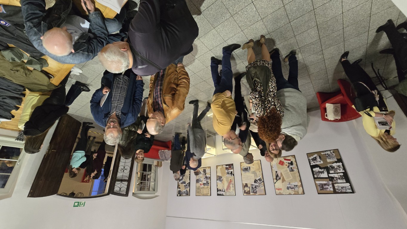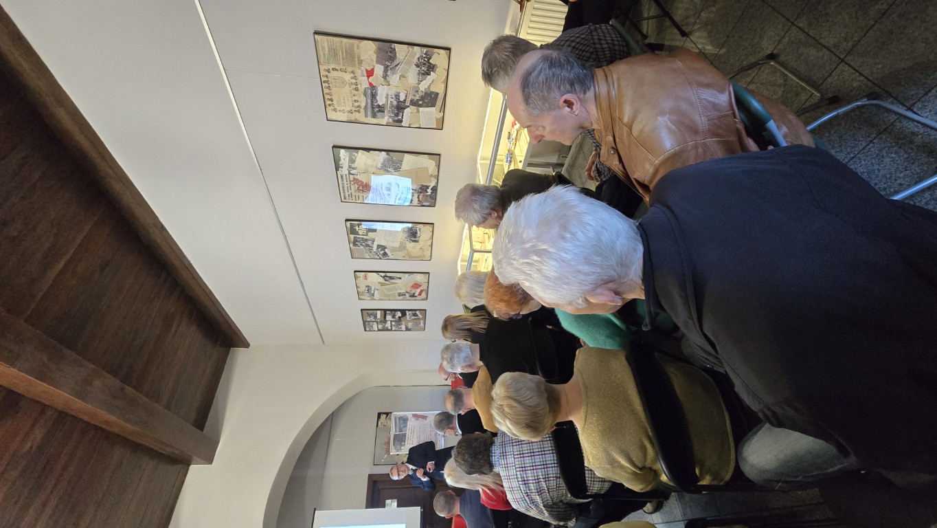 Wnętrze sali wystawowej poświęconej ruchowi „Solidarność” w Polsce. Na ścianie po lewej znajdują się oprawione plansze z dokumentami, fotografiami i grafikami, nad którymi widnieje logo „Solidarność”. Pod nimi ustawiono szklane gabloty zawierające książki, broszury i pamiątki związane z tematyką historyczno-polityczną. Po prawej stronie osoby rozmawiające przy czerwonej sofie oraz widoczni goście w tle. Sala ma biały sufit z widocznymi drewnianymi belkami, jasne ściany i kafelkową podłogę.