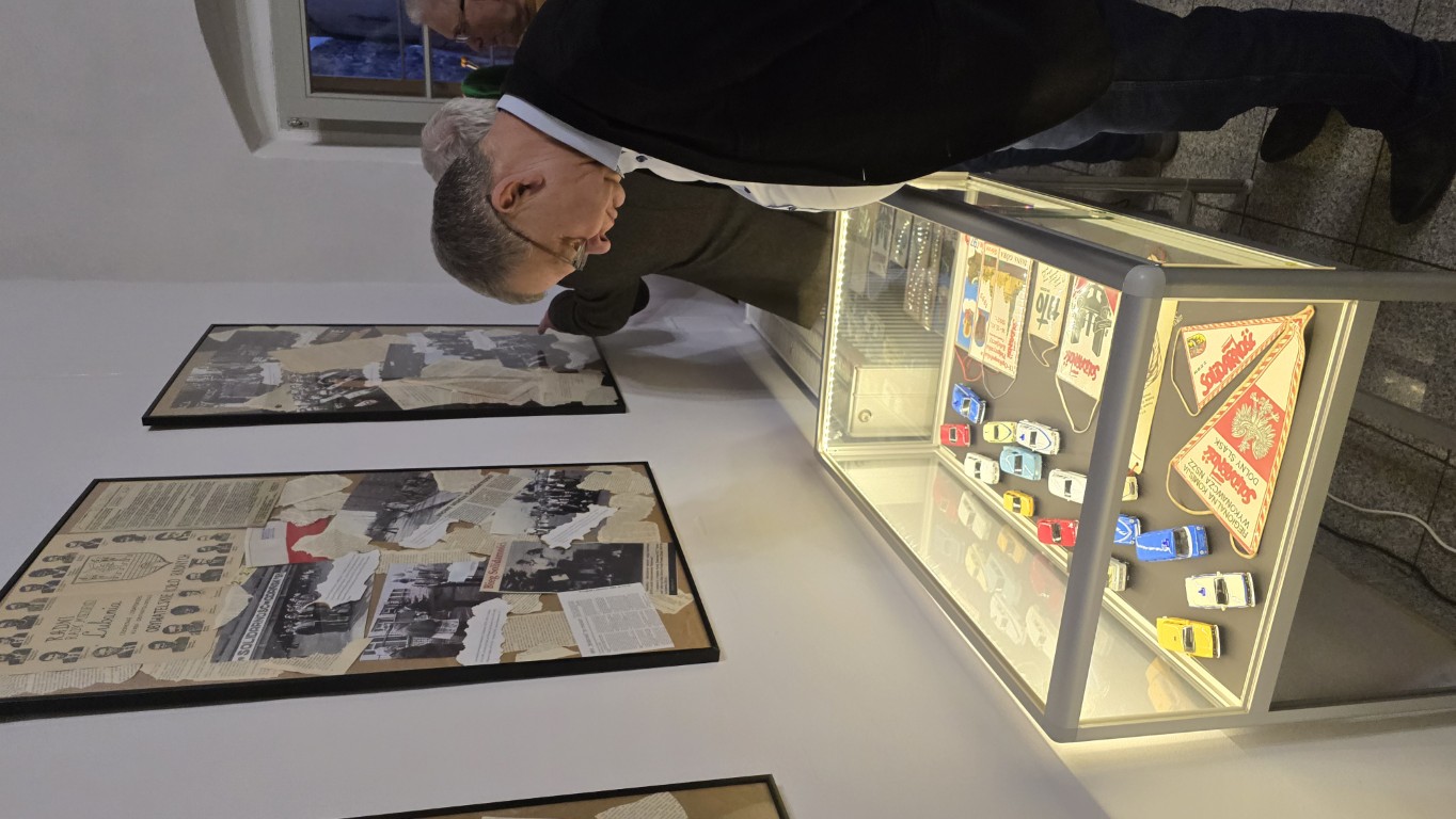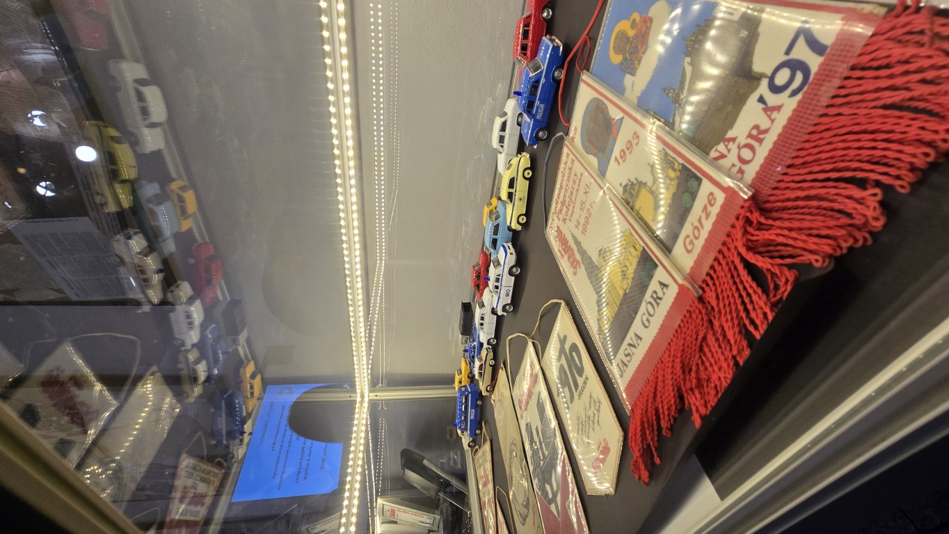 Szklana gablotka zawiera kolekcję miniaturowych modeli samochodów ustawionych w rzędach – w różnych kolorach, m.in.. niebieskim, białym, żółtym i czerwonym. Część modeli przypomina pojazdy policyjne lub ratunkowe. Wśród eksponatów znajdują się również pamiątkowe proporczyki z czerwonymi frędzlami oraz napisy, np. „JASNA GÓRA” i „Górze 1997”. W tle odbijają się kolejne modele aut, widoczne w szklanym odbiciu górnej półki. Ekspozycja jest podświetlona diodami LED, co uwydatnia szczegóły prezentowanych przedmiotów.