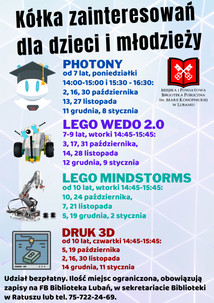 Zapraszamy dzieci na zajęcia z robotyki z robotami Photon, Lego WeDo 2.0 i Lego Mindstorm EV3. Ilość i częstotliwość zajęć zależy od ilości chętnych dzieci. Zapisy prowadzone są w sekretariacie,…