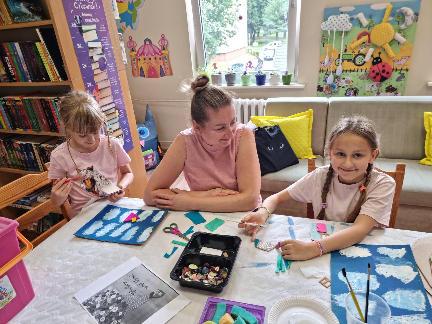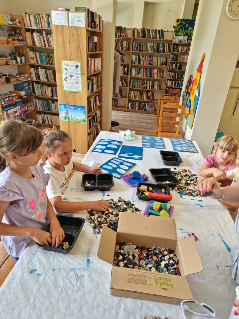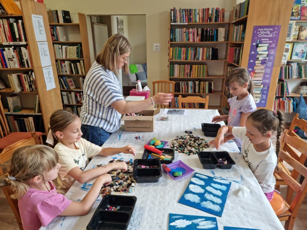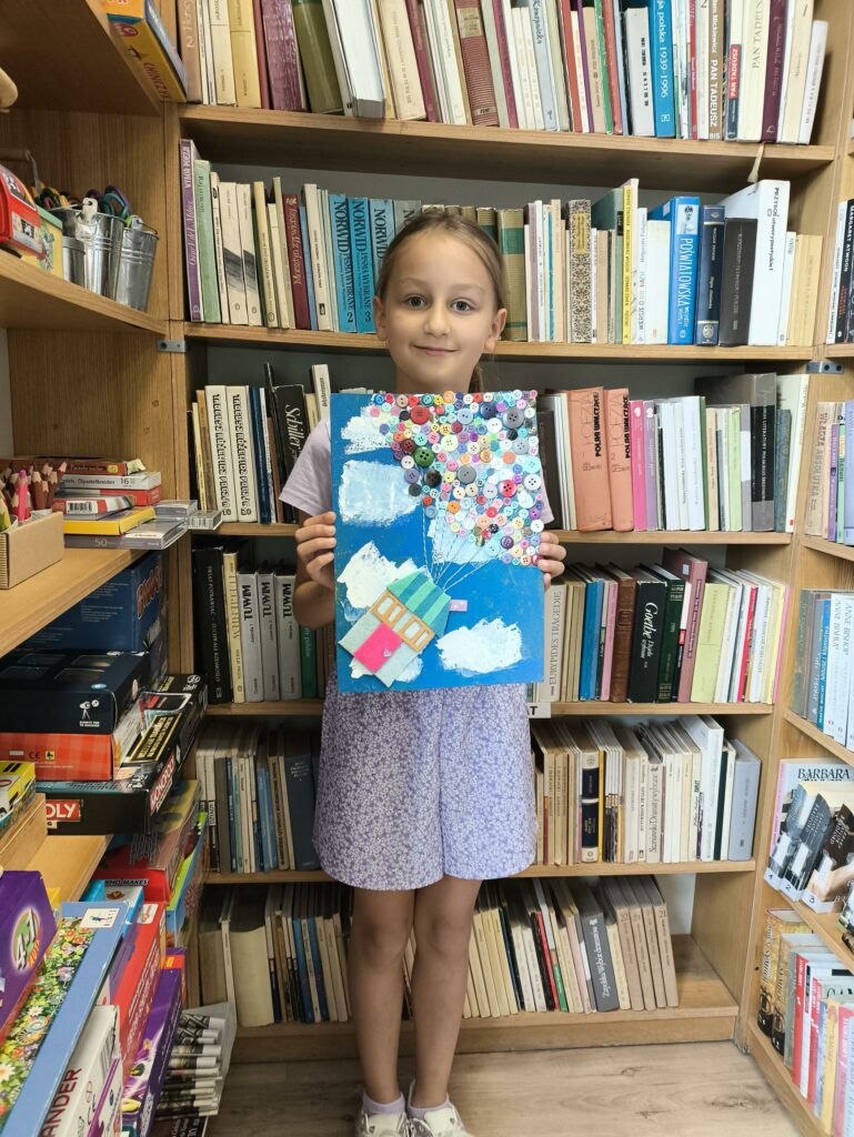 W pierwszym tygodniu zajęć wakacyjnych, w Filii nr 3 na Osiedlu Piastów, dzieci opowiadały tę historię o miłości i przywiązaniu, poprzez tworzenie pięknych prac plastycznych. To była świetna zabawa, szczególnie przy wyborze guzików.