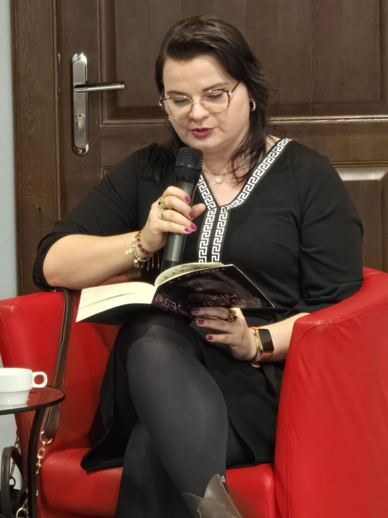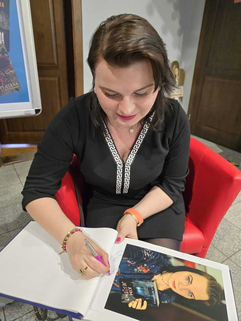 Pani Agnieszka to autorka już trzech książek, która zadebiutowała właściwie dopiero rok temu. Jej ostatnia książka, która ukazała się zaledwie 13 marca to „Kim jestem?”. Pani Milewska pokazała nam się jako bardzo kontaktowa i żywiołowa pisarka, która z chęcią podzieliła się swoimi doświadczeniami z wydawcami, „sposobami na morderstwo” i codziennym życiem początkującego twórcy.