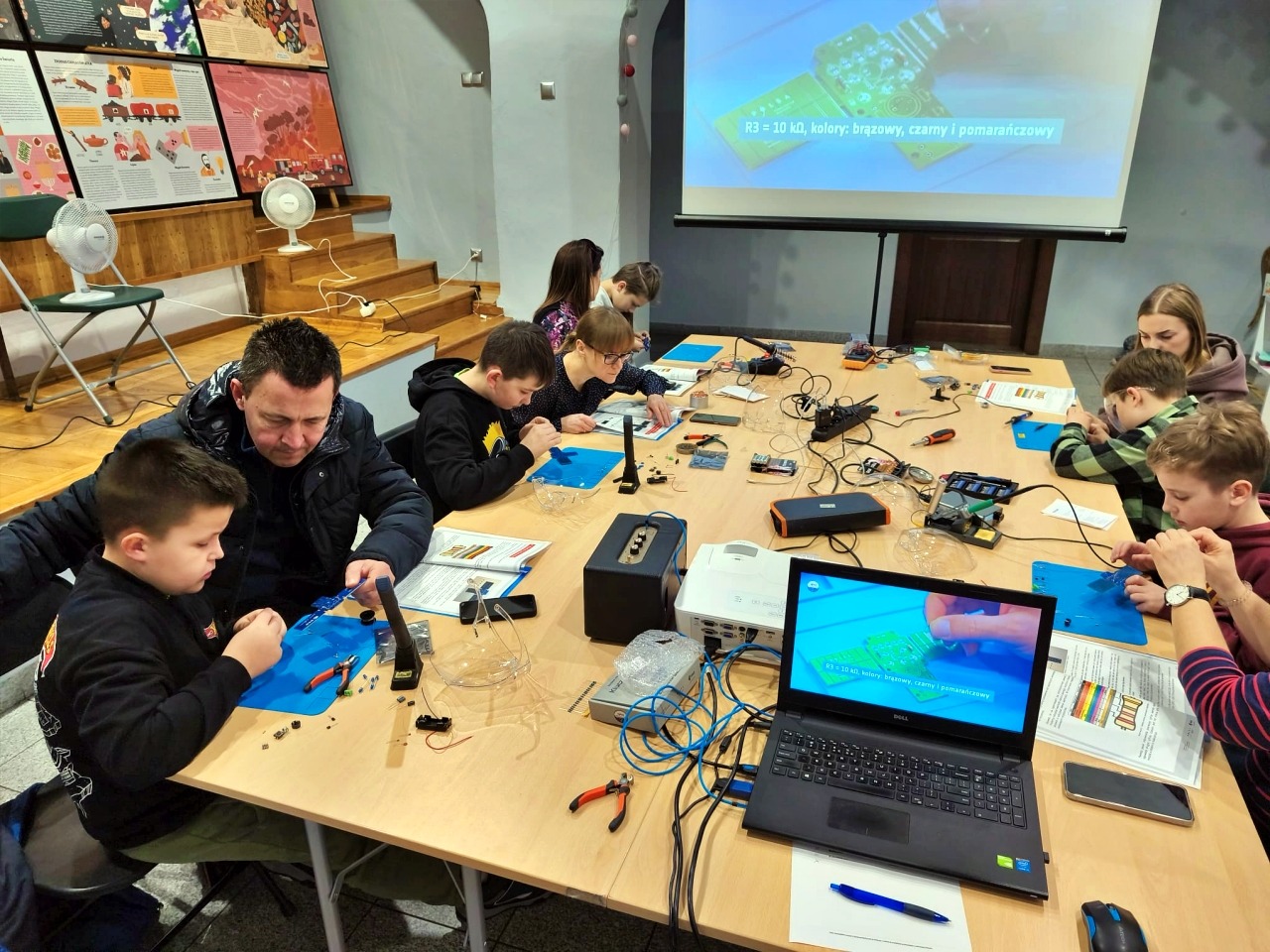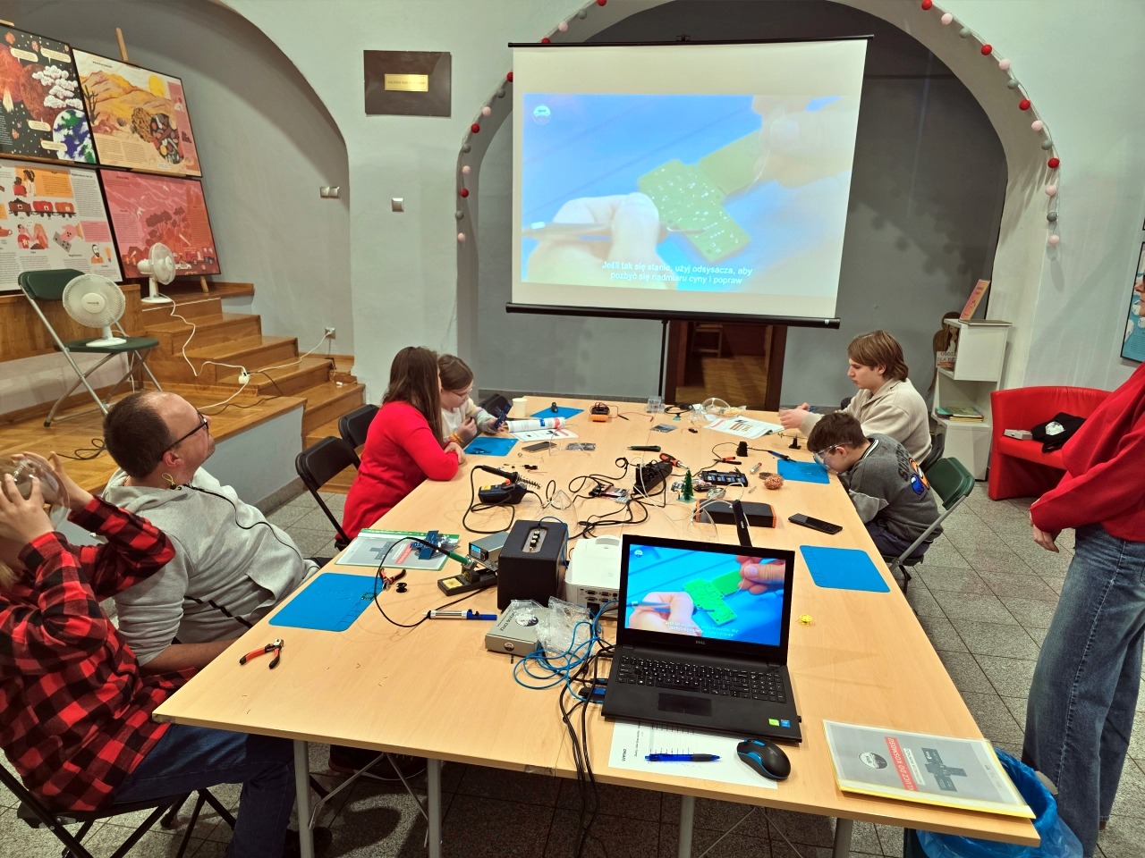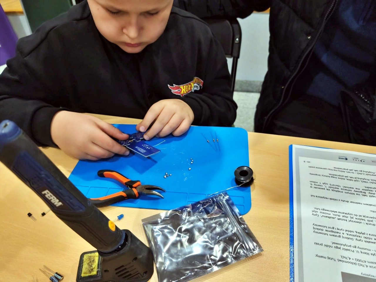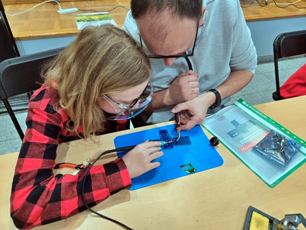 Od pierwszego spotkania towarzyszyła nam ciekawość, ekscytacja i masa nowych doświadczeń. Uczestnicy mierzyli się z pierwszymi próbami lutowania, napotykając naturalne dla początkujących trudności, od utlenionych grotów po drobne sprzętowe zaskoczenia. Mimo tego każdy krok przynosił coraz większą pewność i satysfakcję.