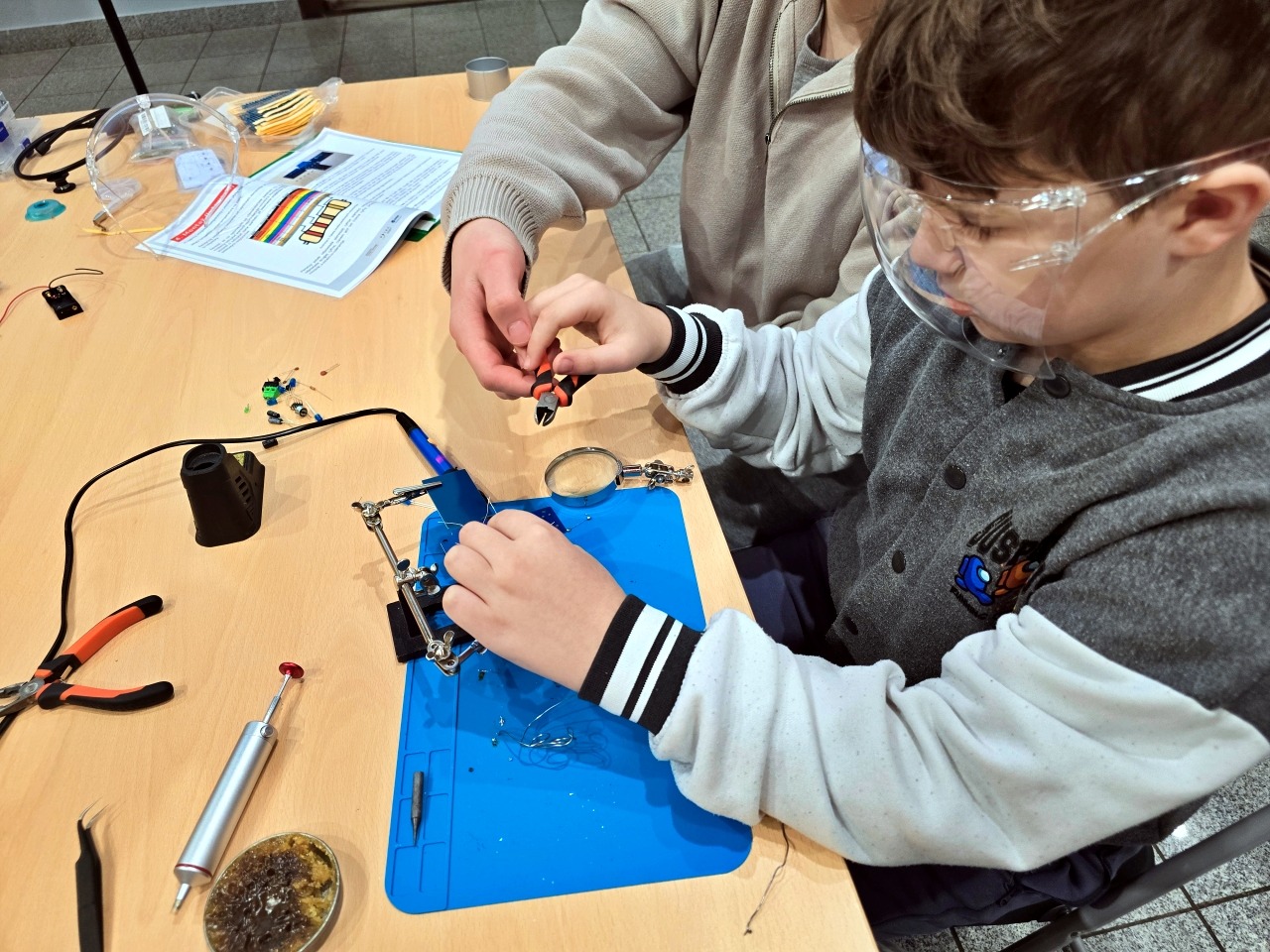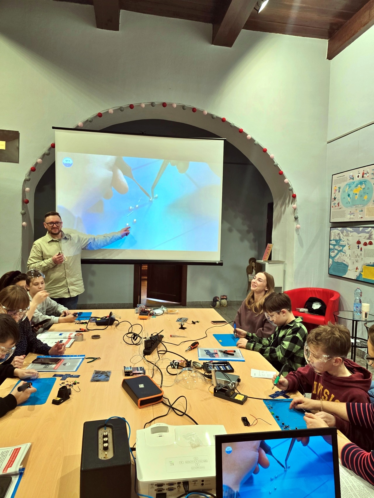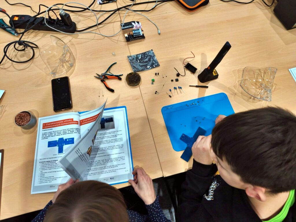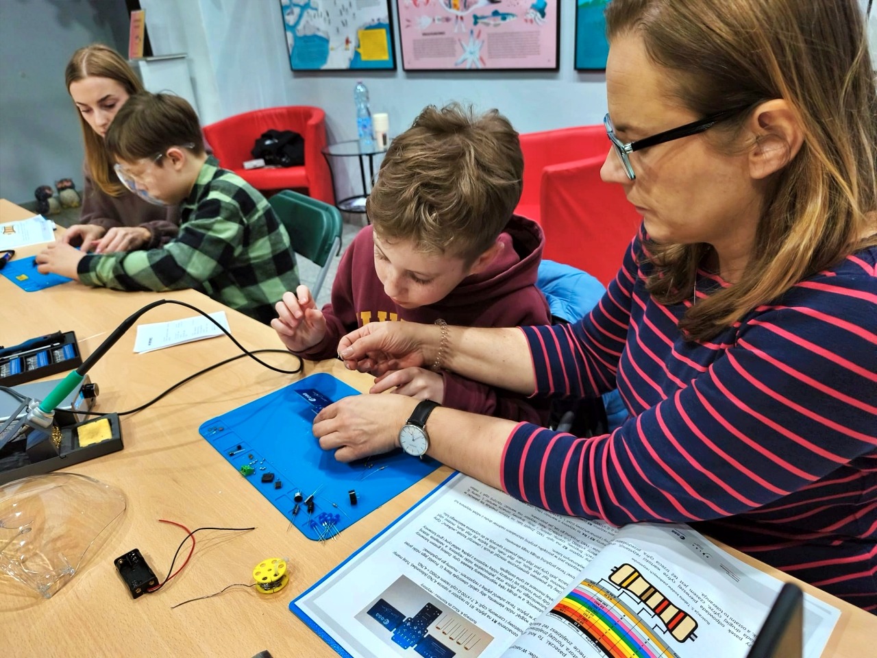 Od pierwszego spotkania towarzyszyła nam ciekawość, ekscytacja i masa nowych doświadczeń. Uczestnicy mierzyli się z pierwszymi próbami lutowania, napotykając naturalne dla początkujących trudności, od utlenionych grotów po drobne sprzętowe zaskoczenia. Mimo tego każdy krok przynosił coraz większą pewność i satysfakcję.