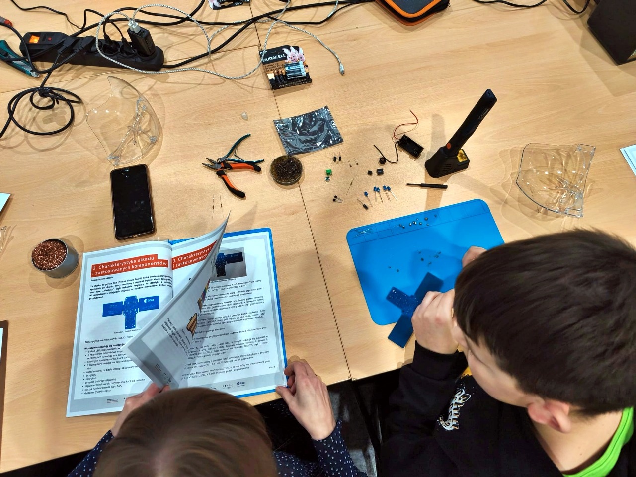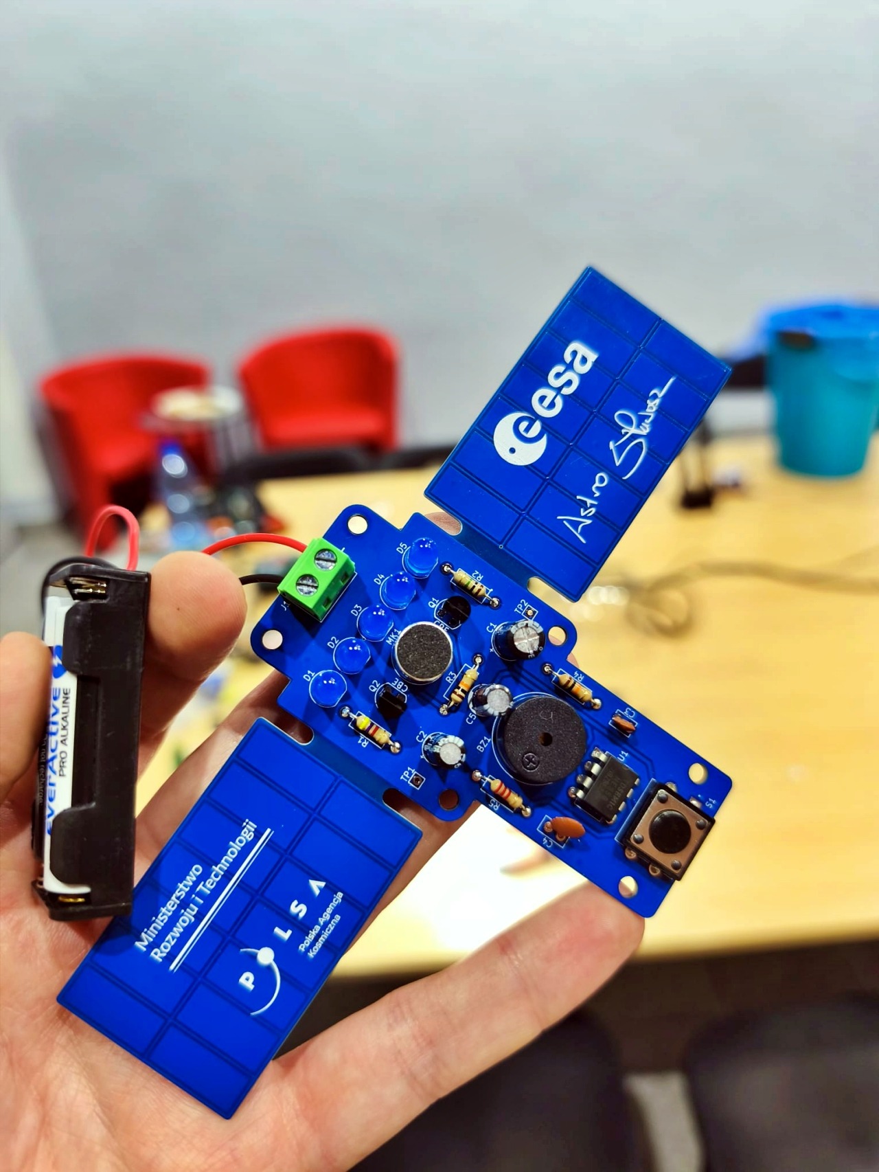 Zajęcia zakończyły się pełnym sukcesem, zestawy zostały zlutowane, a uczestnicy mieli okazję sprawdzić, jak można nadawać i odbierać wiadomości alfabetem Morse’a, wykorzystując własnoręcznie zbudowany mini‑nadajnik w kształcie satelity.