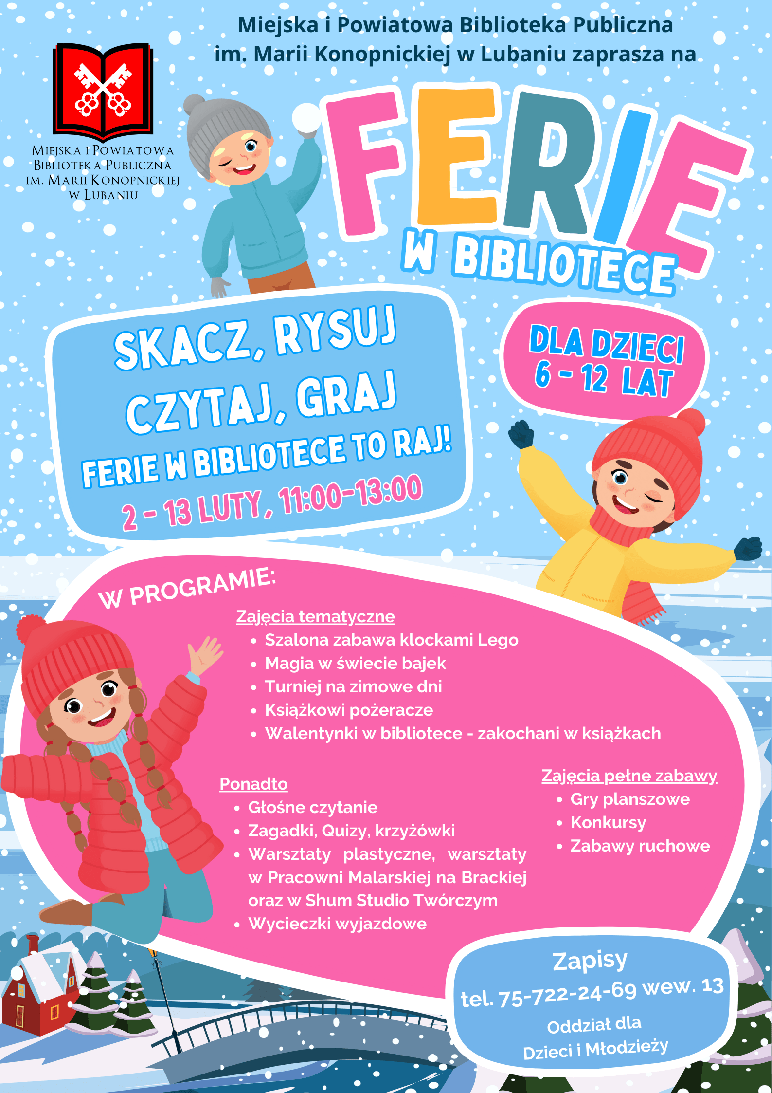 Miejska i Powiatowa Biblioteka Publiczna im. Marii Konopnickiej w Lubaniu, Oddział dla Dzieci i Młodzieży, zaprasza rodziców i opiekunów do zapisów na zorganizowane zajęcia feryjne dla dzieci w wieku 6–12 lat.