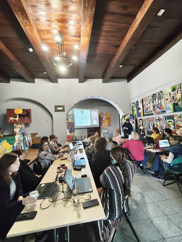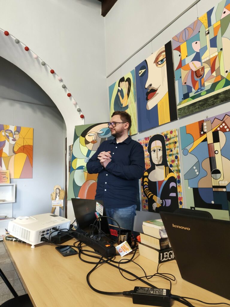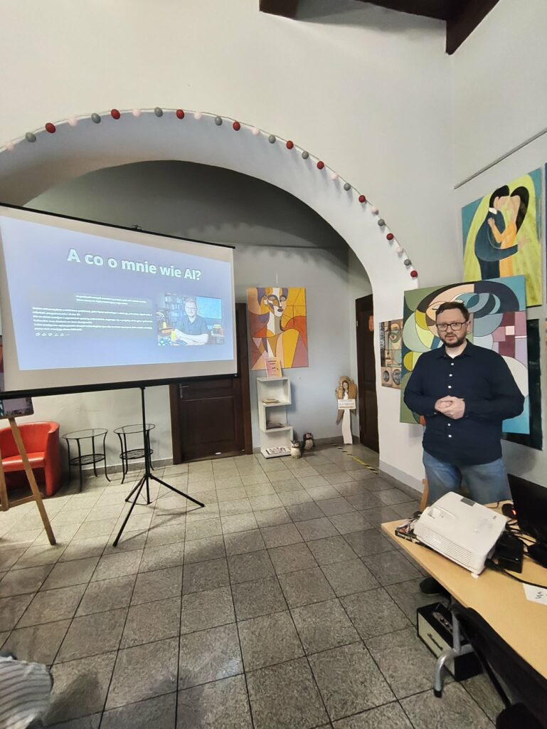 Najpierw dzięki Mentimeter zrobiliśmy burzę mózgu, czym dla nas jest sztuczna inteligencja i jak często z niej korzystamy. Oczywiście okazało się, że natykamy się na nią częściej, niż nam się wydaje. Dowiedzieliśmy się jak „rozmawiać” z chatem i jakimi promptami go „karmić”. Jacek podpowiedział, jak go używać w praktyce, jak generować obrazy i z czym to się wiąże. A na koniec bardzo ważna kwestia – bezpieczeństwo.