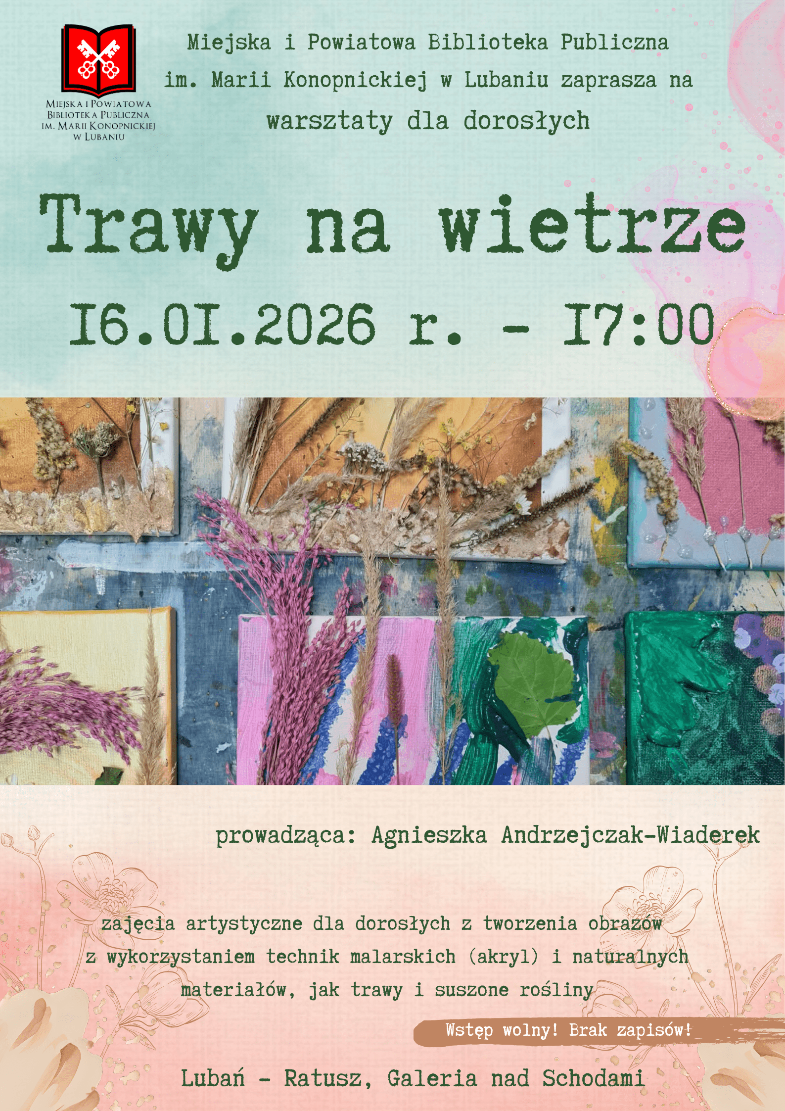 Przyjdź do Galerii nad Schodami 16 stycznia 2026 r. o godz. 17:00 i daj się ponieść naturze. Stwórz obraz, który będzie stworzony pod czujnym okiem profesjonalistki – Pani Agnieszki Andrzejczak-Wiaderek.