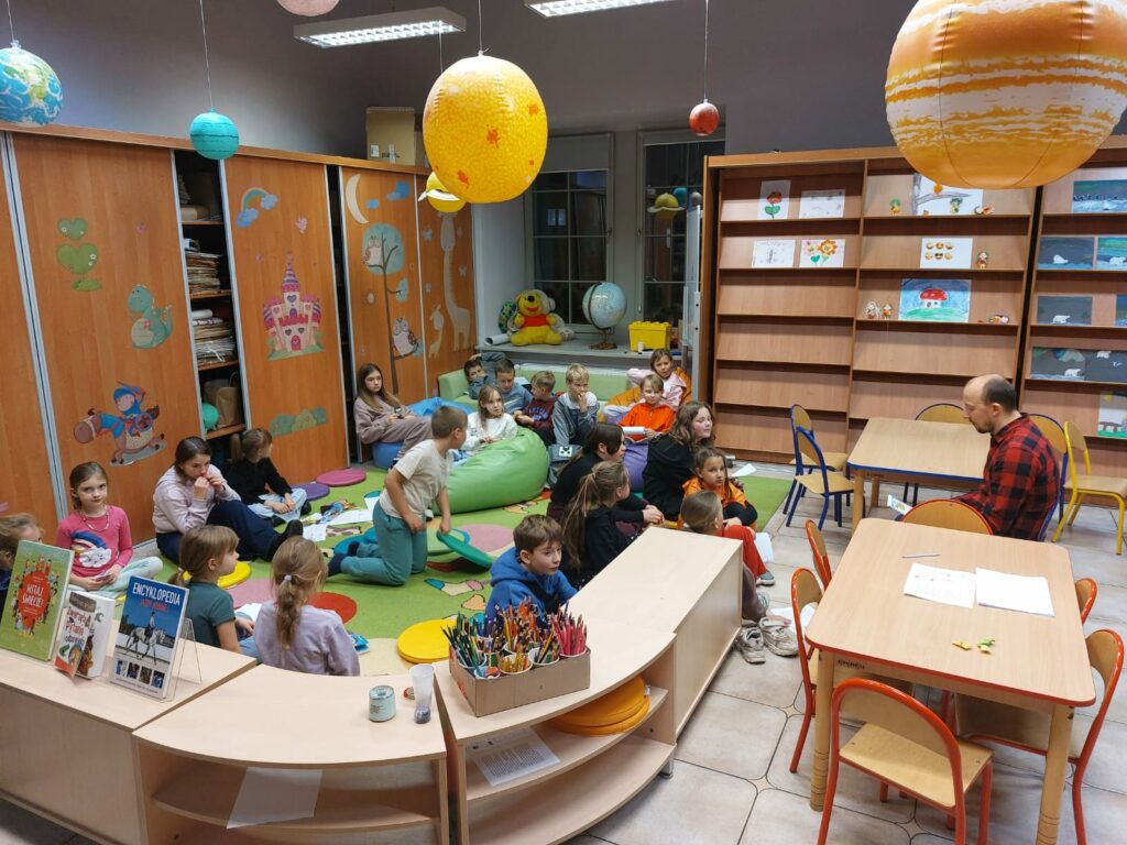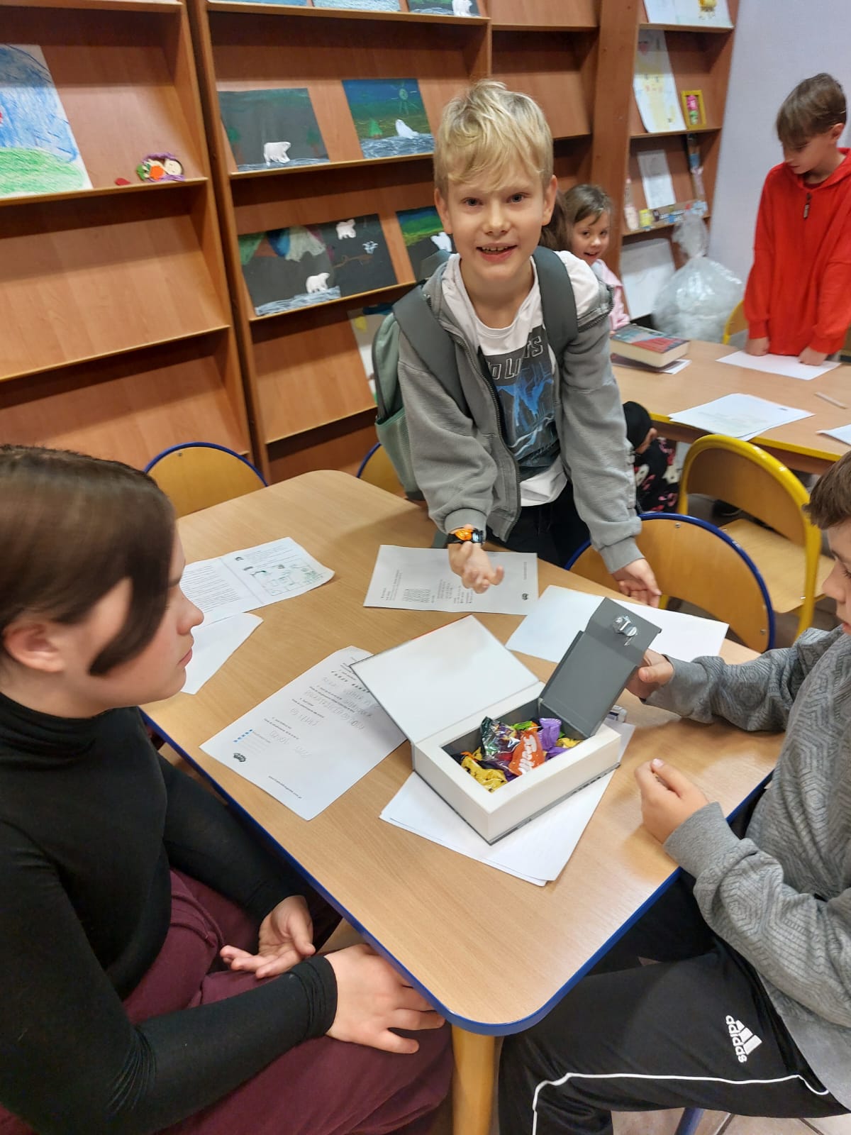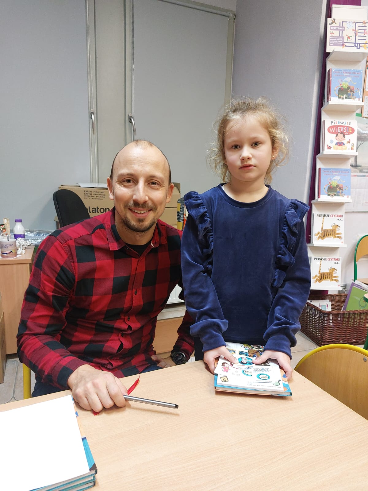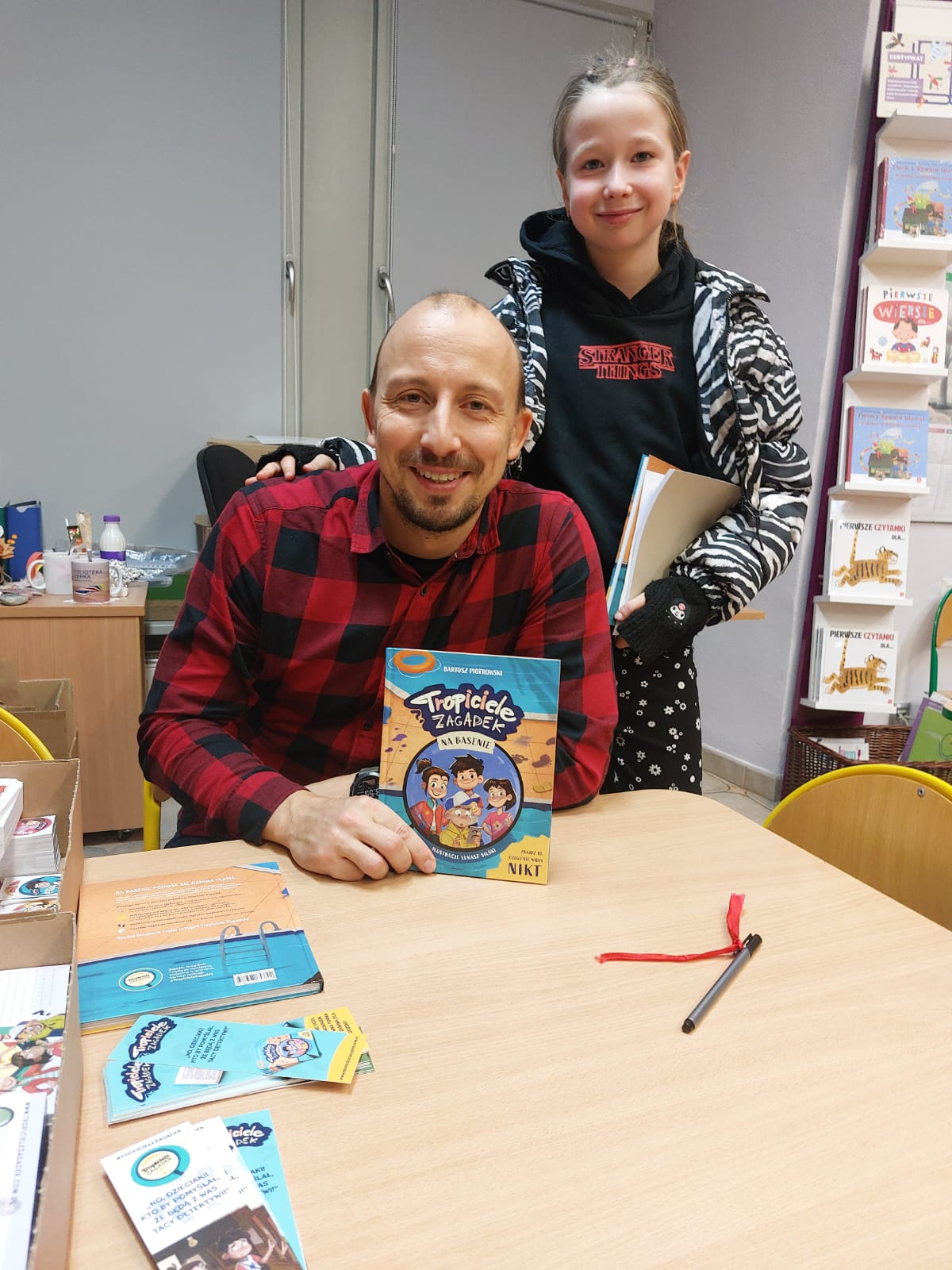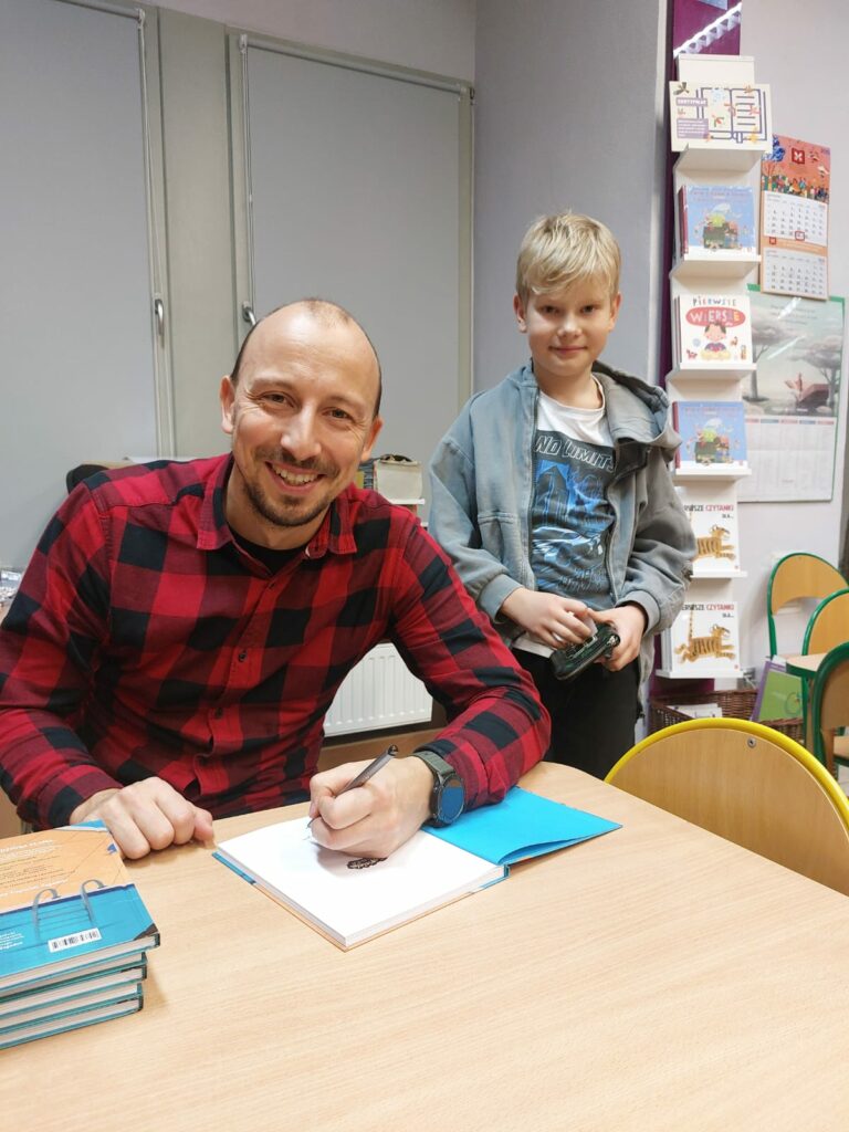 Dziękujemy autorowi oraz jego przemiłej ekipie za świetne odwiedziny i sprawienie, że nasi mali detektywi opuszczali bibliotekę z wypiekami na szczęśliwych buziach.