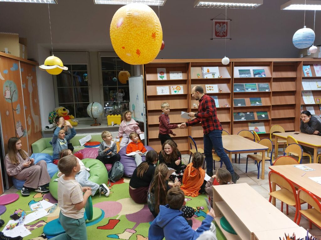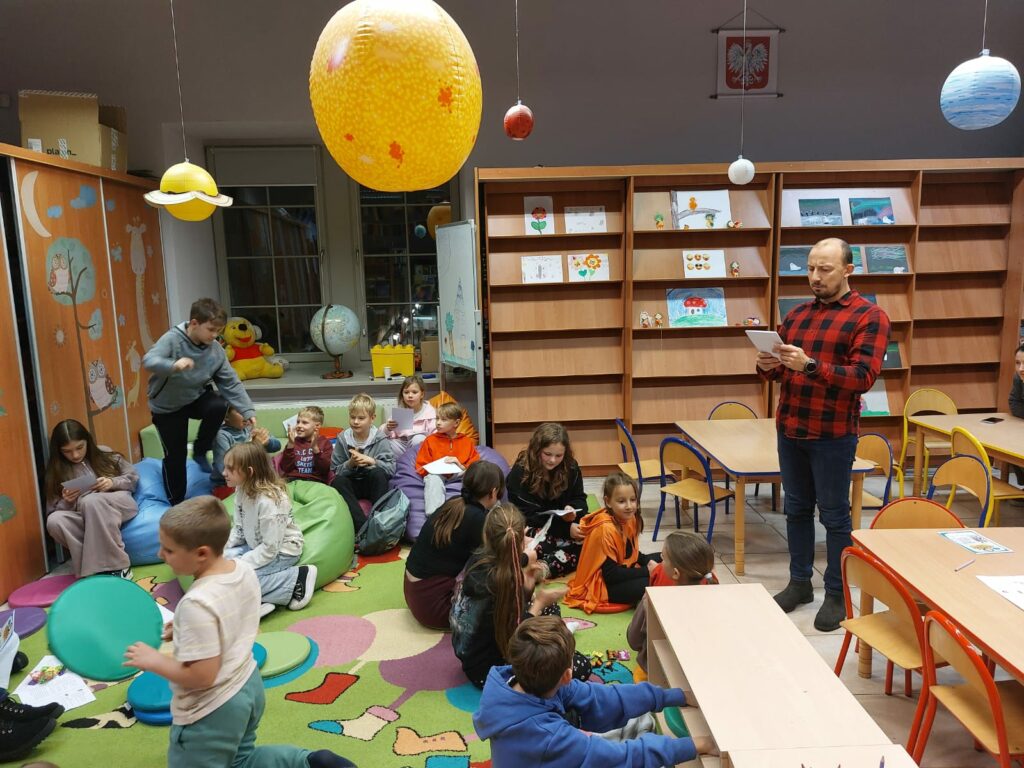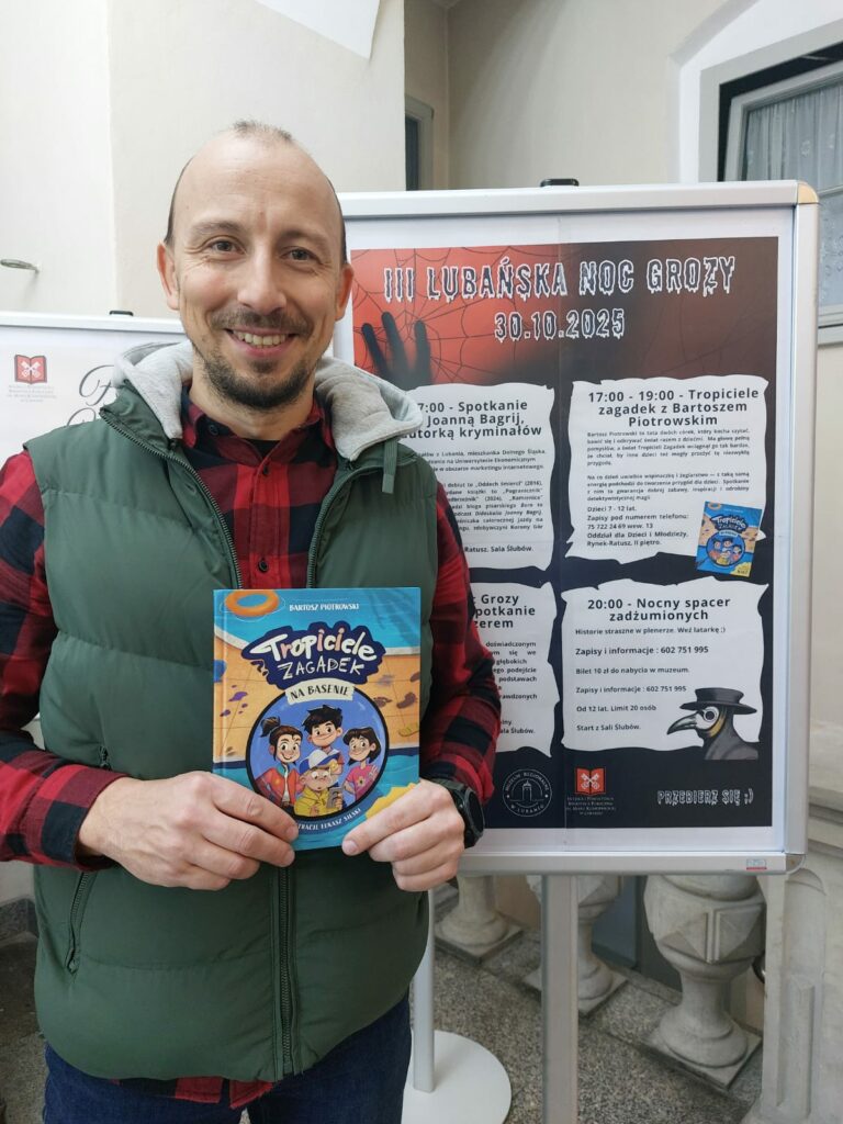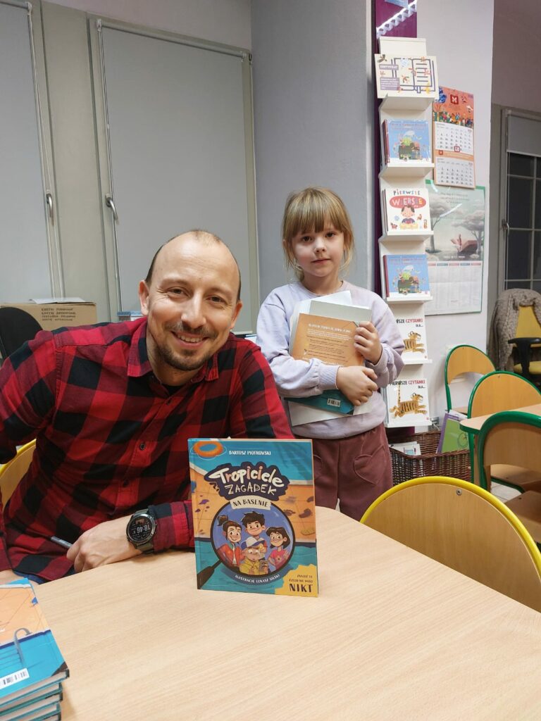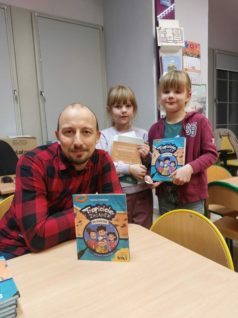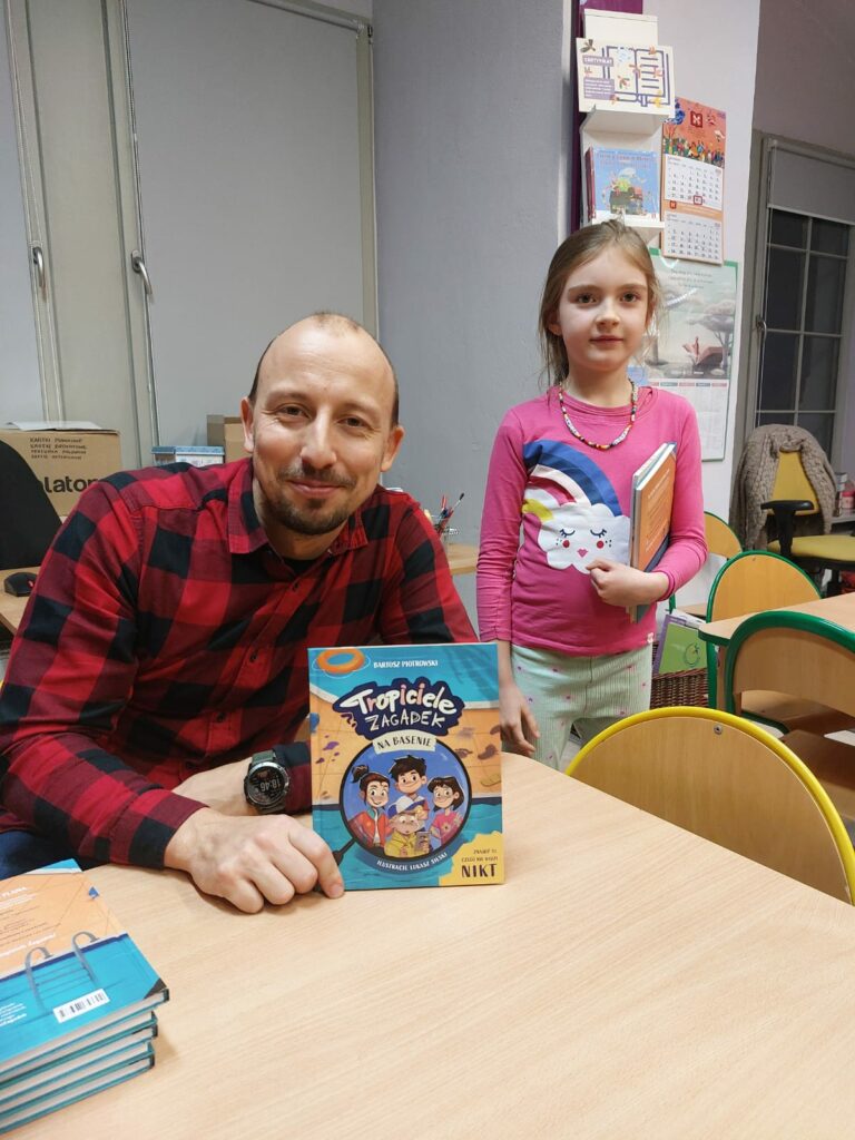 Wodzirejem imprezy był pan Bartosz Piotrowski – autor książki pt. „Tropiciele Zagadek. Na basenie”. Tropiciele Zagadek to genialna książka, która wciąga jak gra przygodowa, rozwija logiczne myślenie i spostrzegawczość, uczy, że nie każda tajemnica kryje złe intencje.