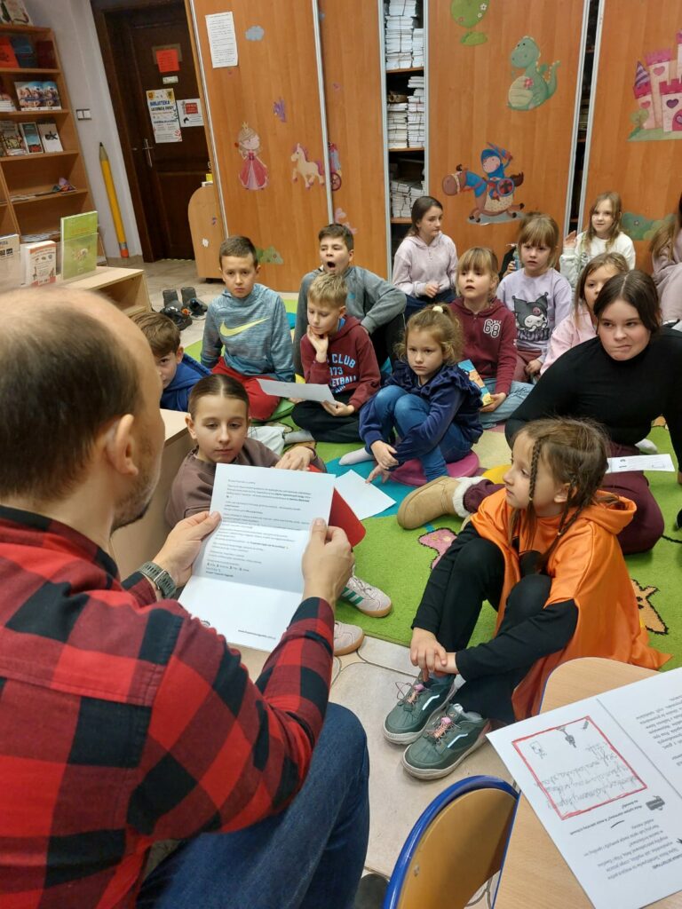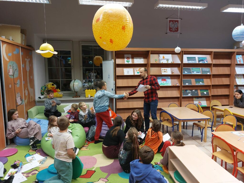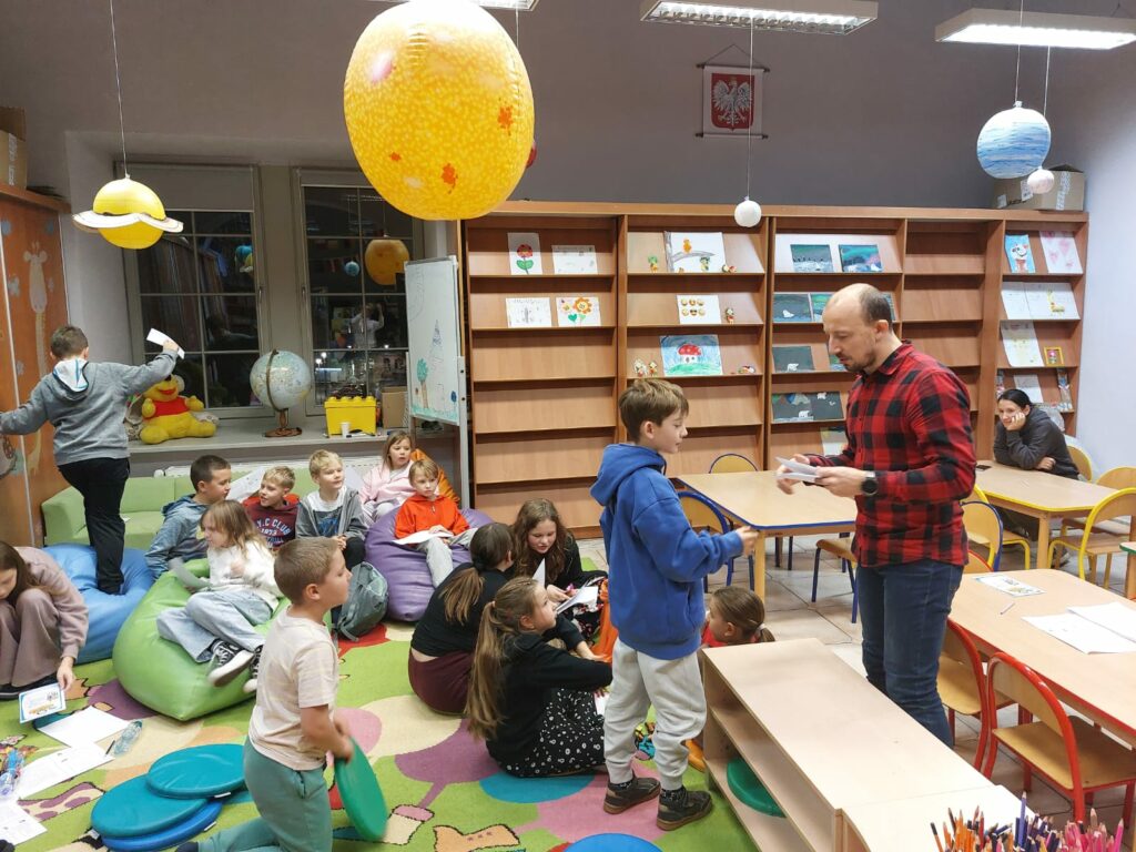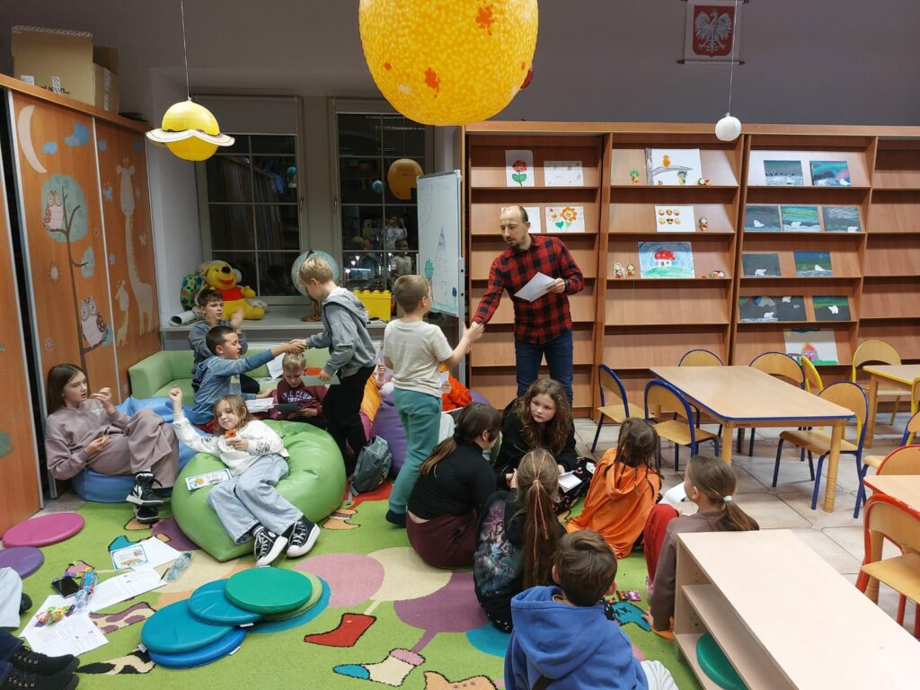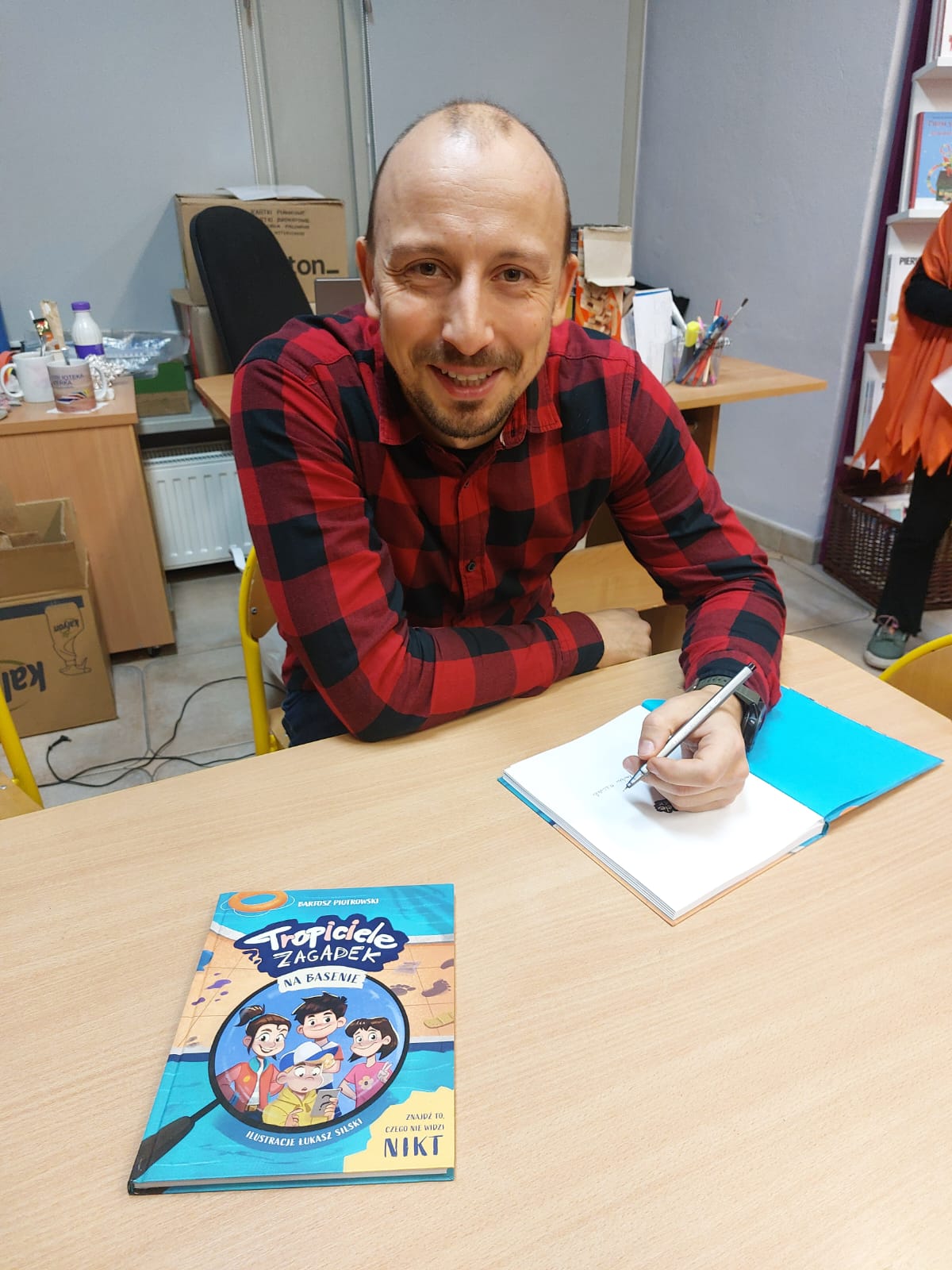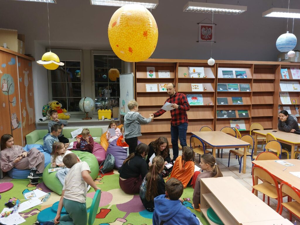 Wodzirejem imprezy był pan Bartosz Piotrowski – autor książki pt. „Tropiciele Zagadek. Na basenie”. Tropiciele Zagadek to genialna książka, która wciąga jak gra przygodowa, rozwija logiczne myślenie i spostrzegawczość, uczy, że nie każda tajemnica kryje złe intencje.