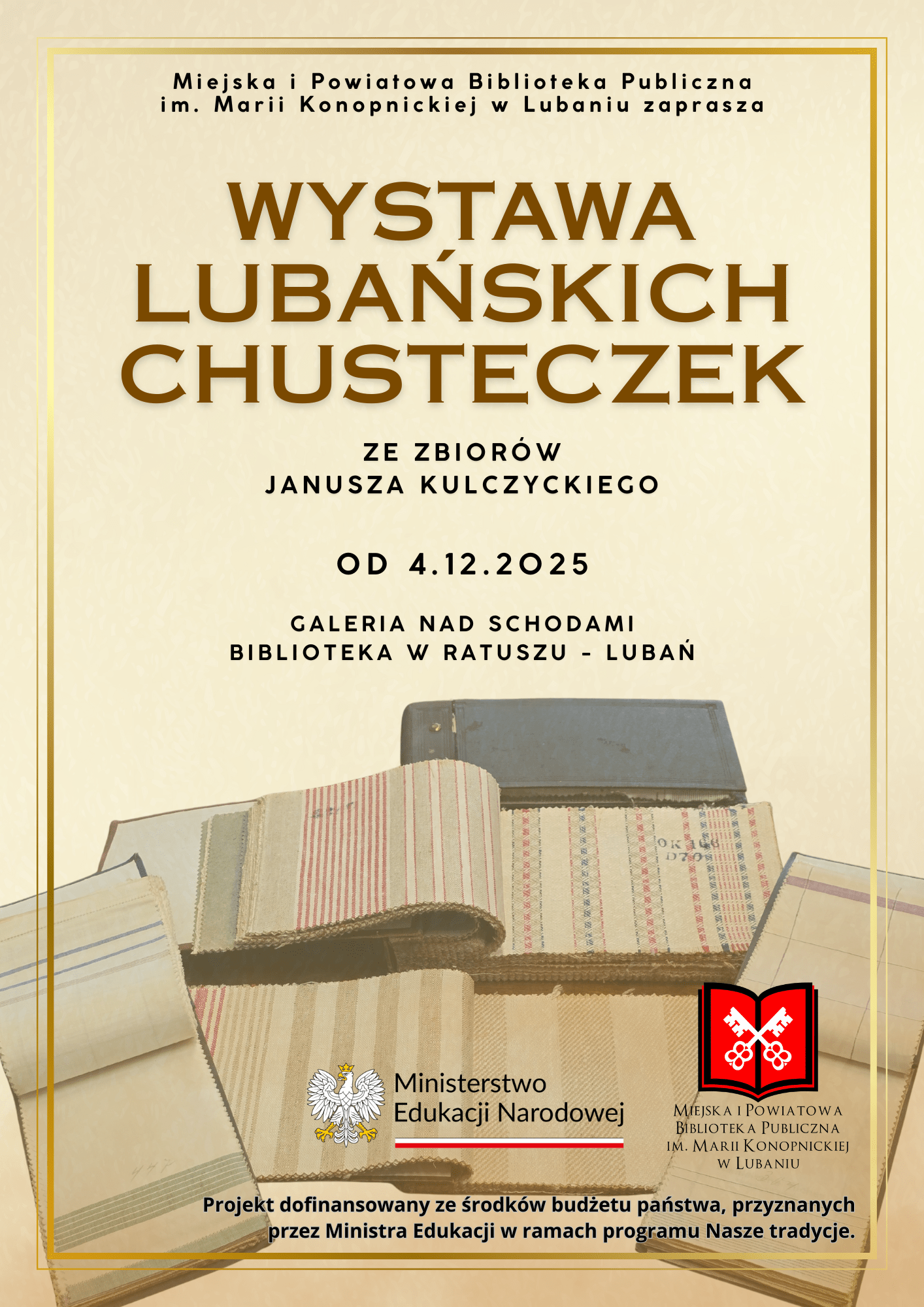 Zapraszamy od 4 grudnia 2025 do Galerii nad Schodami w Bibliotece w Ratuszu na wystawę lubańskich chusteczek ze zbiorów Pana Janusza Kulczyckiego.