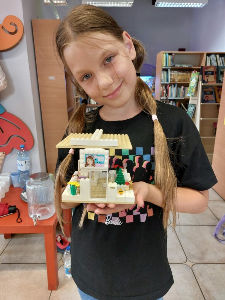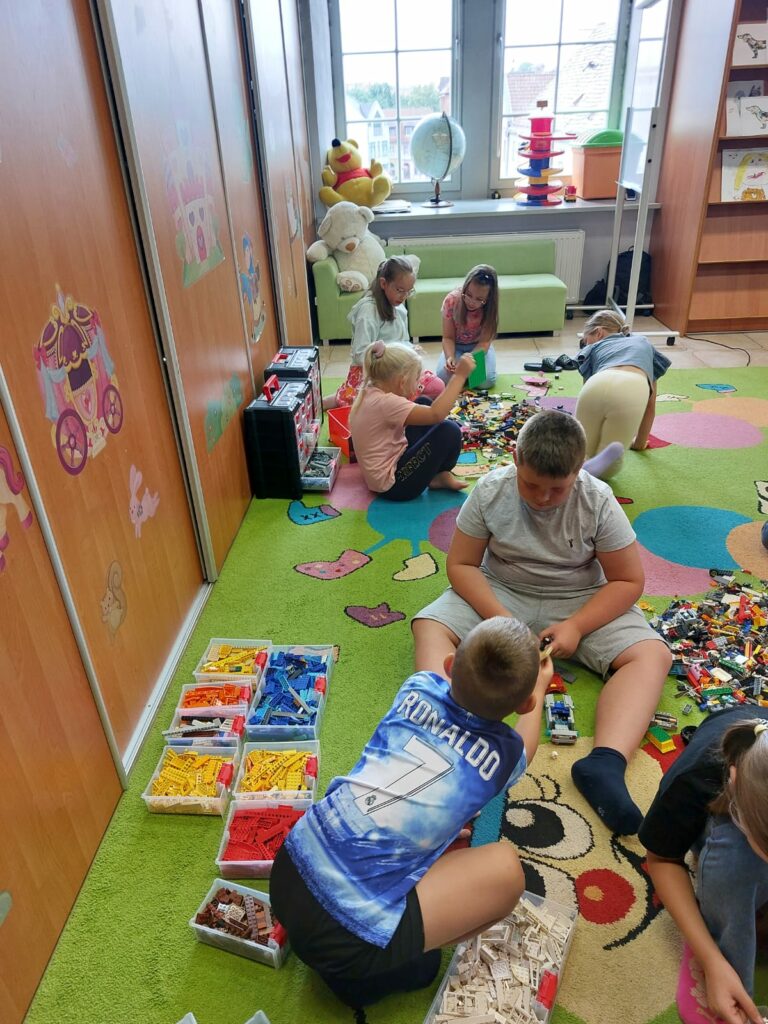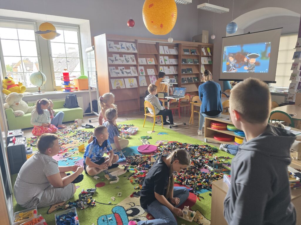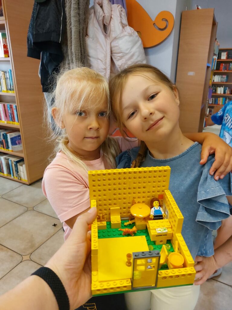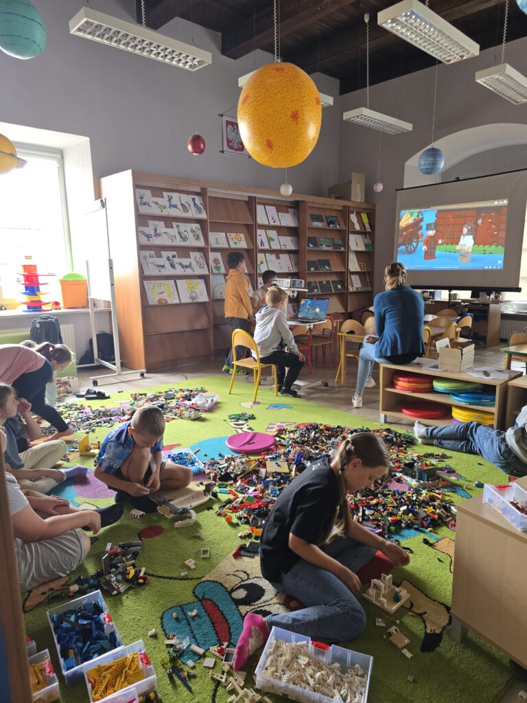 Kolejny dzień to spotkanie z youtuberem Poskładannym. Na rzutniku dzieci obejrzały półgodzinny filmik przedstawiający historię Polski, stworzony przy pomocy klocków Lego. Kolejnym krokiem było zanurzenie się w bibliotecznych zasobach klocków i stworzenie swoich własnych historii.